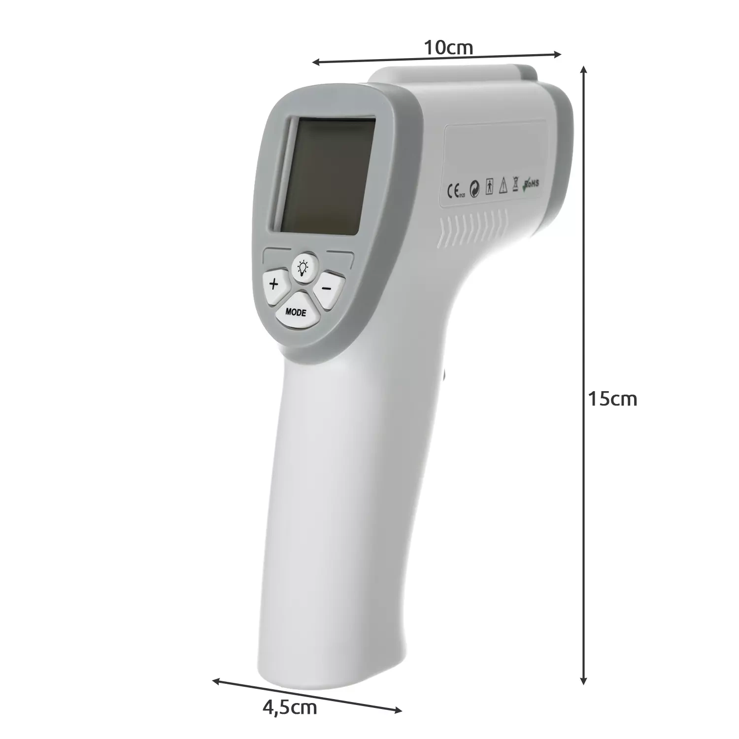 • SPECYFIKACJA - zakres pomiaru temp. ciała: 35-43ºC; zakres pomiaru temp. powierzchni: 0-100ºC; dokładności pomiaru: temperatury ciała: +/- 0,3/0,2ºC,- temperatury przedmiotu: +/- 01ºC; czas wykonania pomiaru: 1 sekunda; certyfikat: zgodny z Dyrektywą 93/42/EEC; funkcje: mierzenie temperatury ciała, mierzenie temperatury powierzchni; jednostki pomiaru temperatury: ºC i ºF; wyświetlacz LCD: tak; podświetlenie wyświetlacza: w kolorze  zielony / czerwony / pomarańczowy; odległość pomiaru: 3 cm - 5 cm; pamięć: na 32 odczyty; możliwość wyłączenia dźwięku kontrolnego; zasilanie: bateryjne 2 x AAA (brak w zestawie); czujnik niskiego poziomu baterii; automatyczne wyłączanie: po 20 sekundach bezczynności; wymiary: 15x10x4,5cm; waga: 112 g; waga w opakowaniu: 212 g.