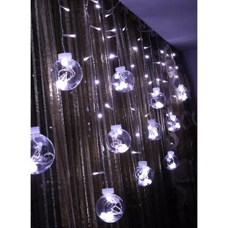 - SPECYFIKACJA - Ilość trybów: 8; rodzaj oświetlenia; LED; barwa światła: zimny biały; ilość diod: 108; klasa wodoodporności: IP44; sterownik: tak; zasilanie: sieć energetyczna; moc: 3,6W; napięcie: 230V / 31V; średnica kuli: 8 cm; długość całkowita: 540cm; szerokość kurtyny świetlnej: 250cm; długość sopla: 95 cm; waga: 0,464 kg; waga w opakowaniu: 0,637 kg.