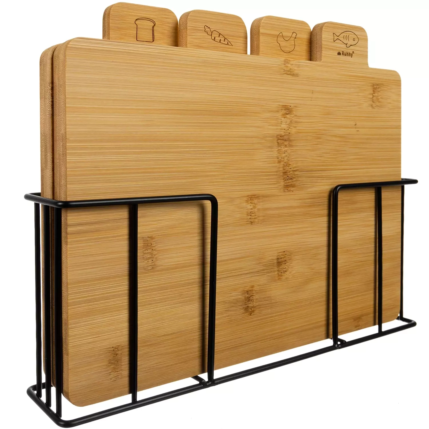 - SPECYFIKACJA: materiał: bambu; ilość sztuk w zestawie: 4; stojak w zestawie: tak; odporna na wilgoć: tak; nie chłonie zapachów: tak; szybko schnie: tak; wymiary całości: 23,5/6,5/28,5cm; wymiar jednej deski: 28/20/1,2cm; waga: 1,86kg; waga w opakowaniu: 1,98kg.