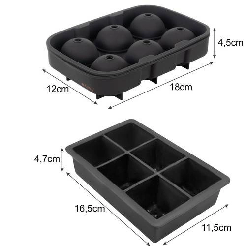 - SPECYFIKACJA - kolor: szary; materiał: silikon + PP; ranty zabezpieczające przed rozlaniem wody: tak; ilość kostek formie: 6; ilość kulek w formie: 6; wymiary formy kulek lodowych:12 x 18 x 4,5 cm; średnica kuli lodowej 4 cm; wymiary formy kostek 11,5 x 16,5 x 4,7 cm, wymiar kostki 4,8 x 4,8 x 4,8 cm; waga: 301g; waga w opakowaniu: 319g.
