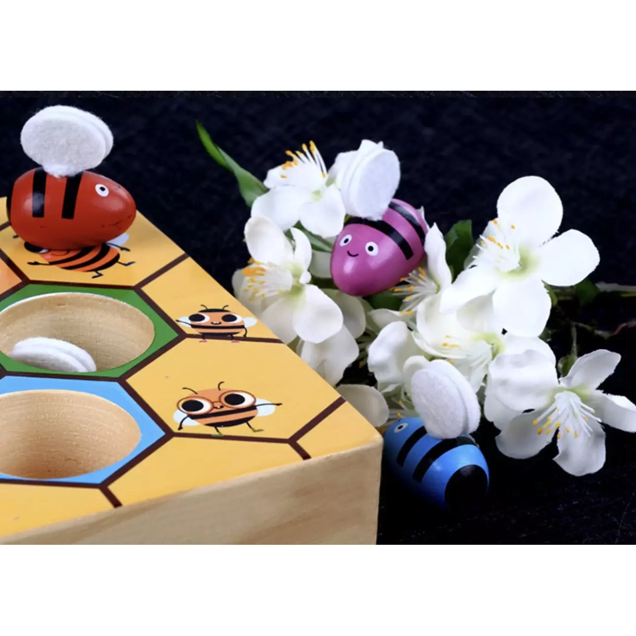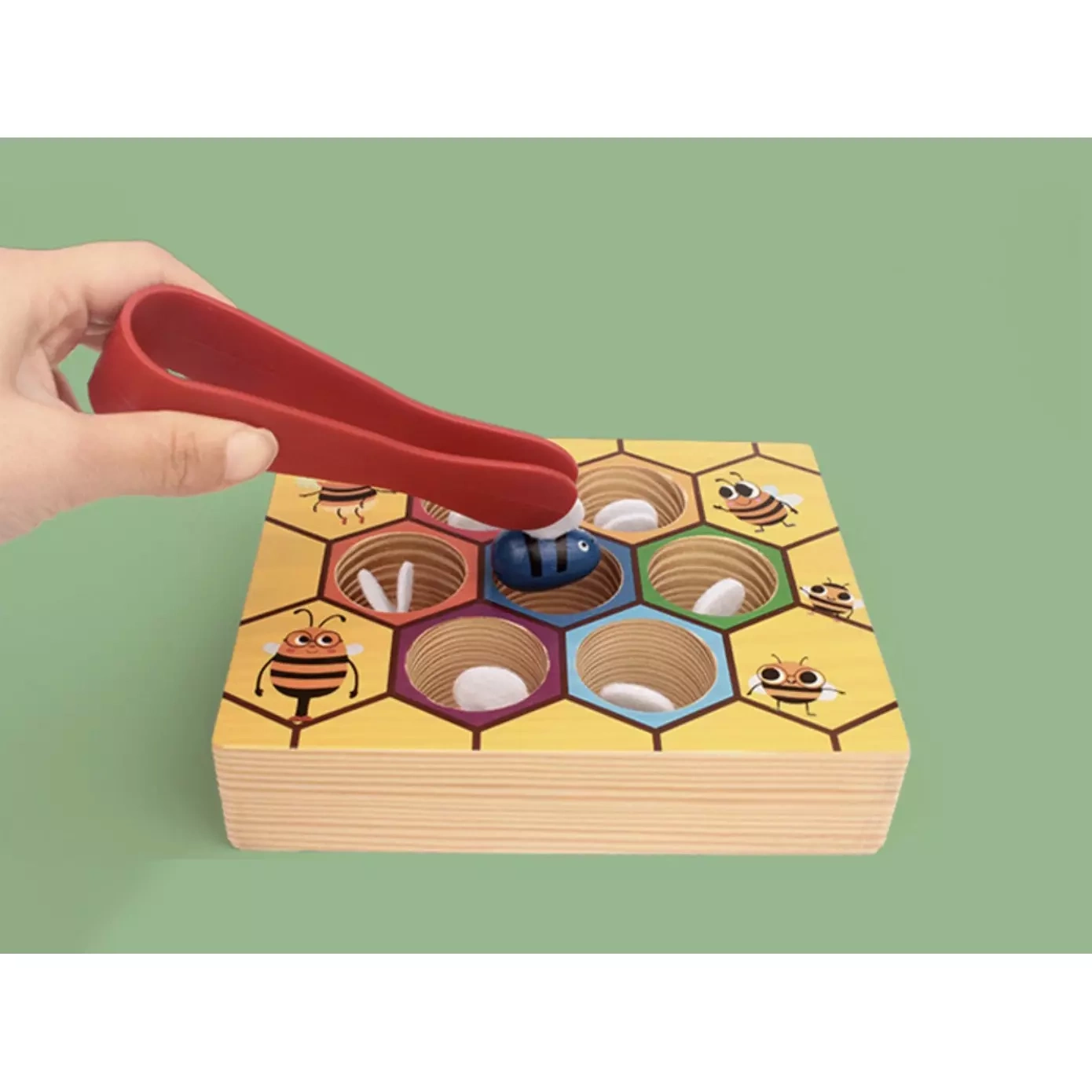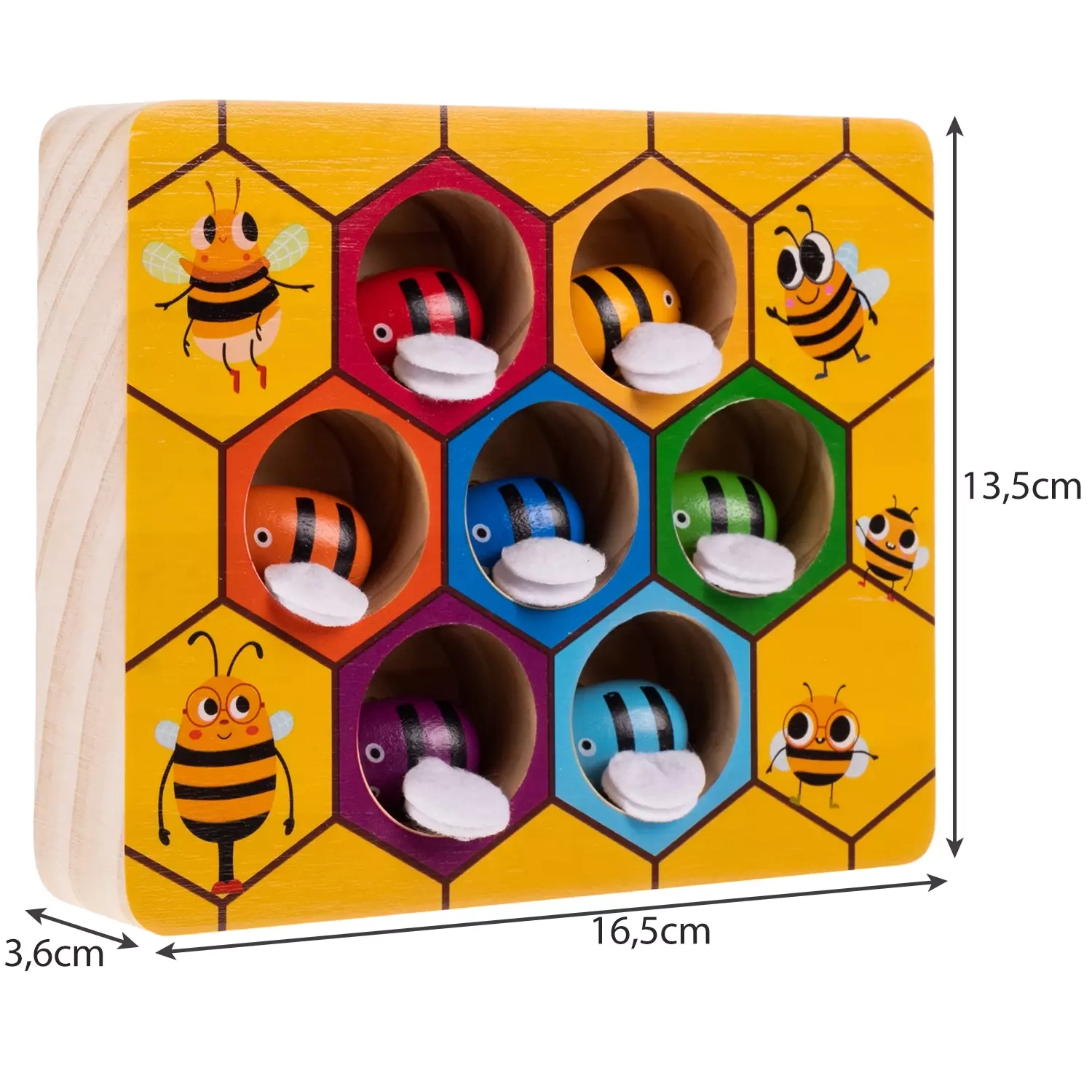 SPECYFIKACJA - kolor: wielokolorowy; material: drewno + pszczółki:drewno + włóknina + szczypce: PE; ilość otworów i pszczół: 7; średnica otworu: 3,5 cm; długość pszczółki: 2,8 cm; wymiar pudełka: 16,5 x 13,5 x 3,6 cm