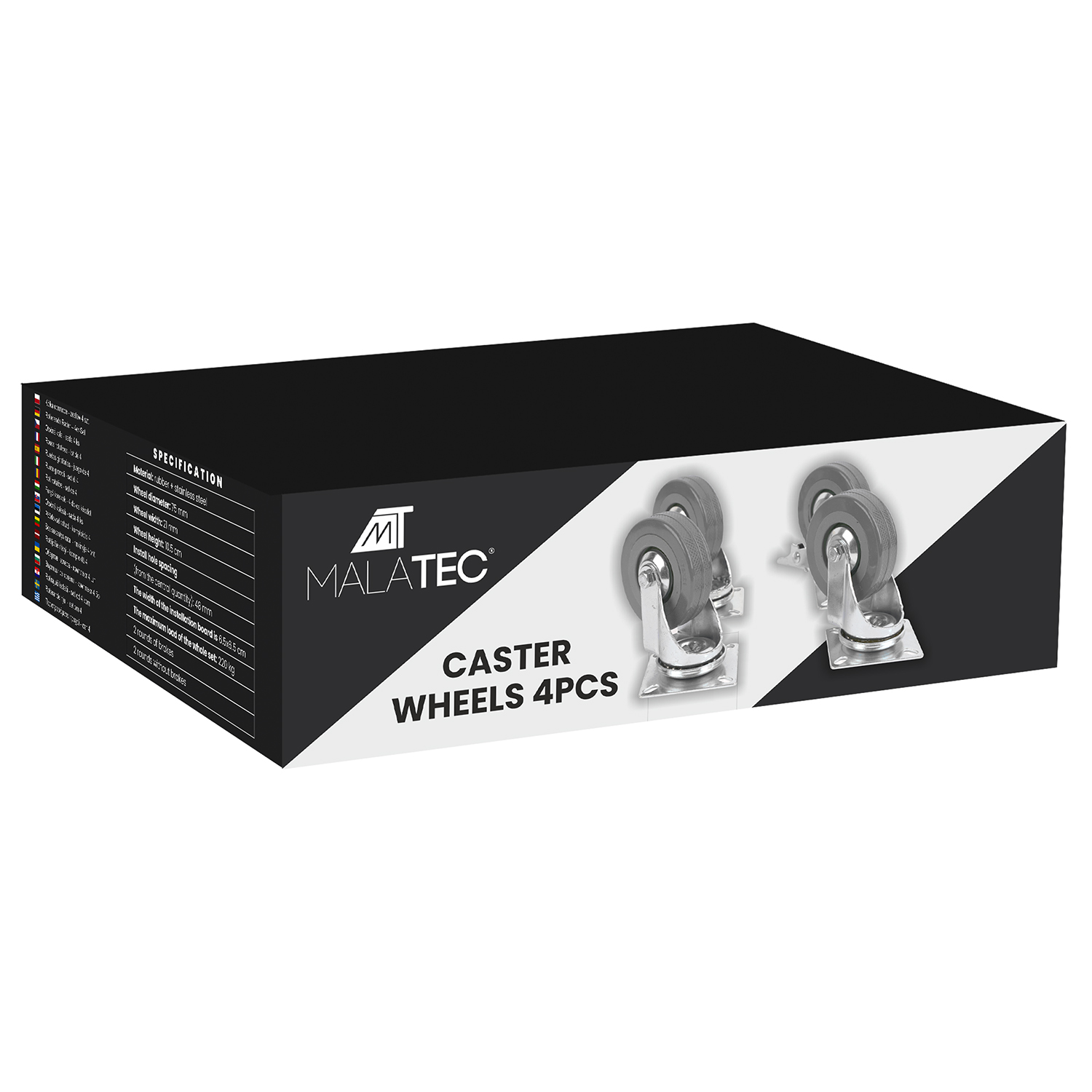 ✔️ wytrzymają duże obciążenie - zestaw 4 kółek przemysłowych MALATEC 75 mm wytrzymuje do 220 kg łącznego obciążenia, co czyni je doskonałymi do sprzętu magazynowego, mebli warsztatowych czy regałów transportowych