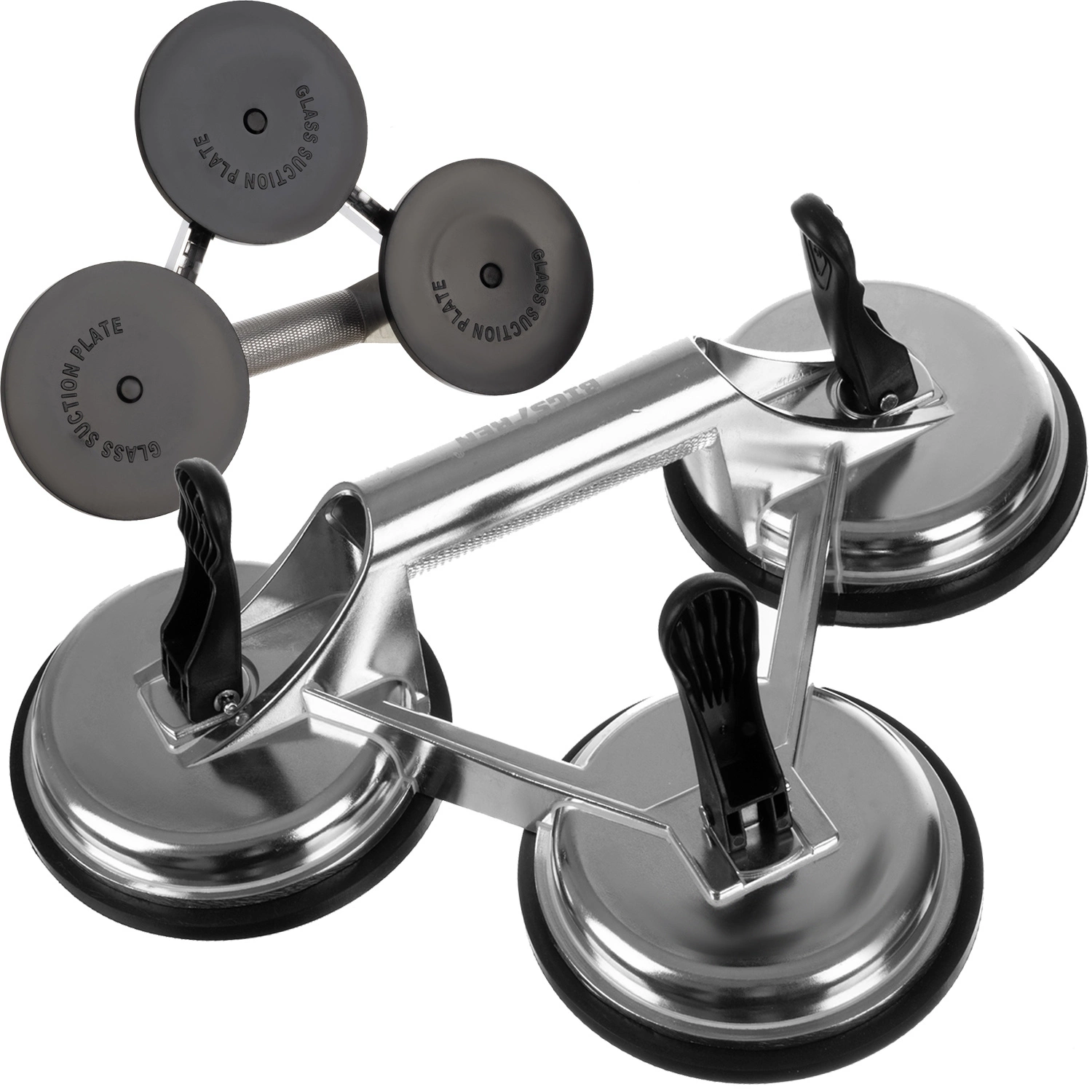 ✔️ dobrze trzyma się powierzchni - urządzenie ma 3 mocne gumowe przyssawki o średnicy 120 mm, które przylegają równomiernie do gładkich i gazoszczelnych powierzchni, dzięki mechanizmowi dociskowemu z dźwignią każda ssawka zasysa się z odpowiednią siłą, zapewniając pewność chwytu i bezpieczeństwo pracy