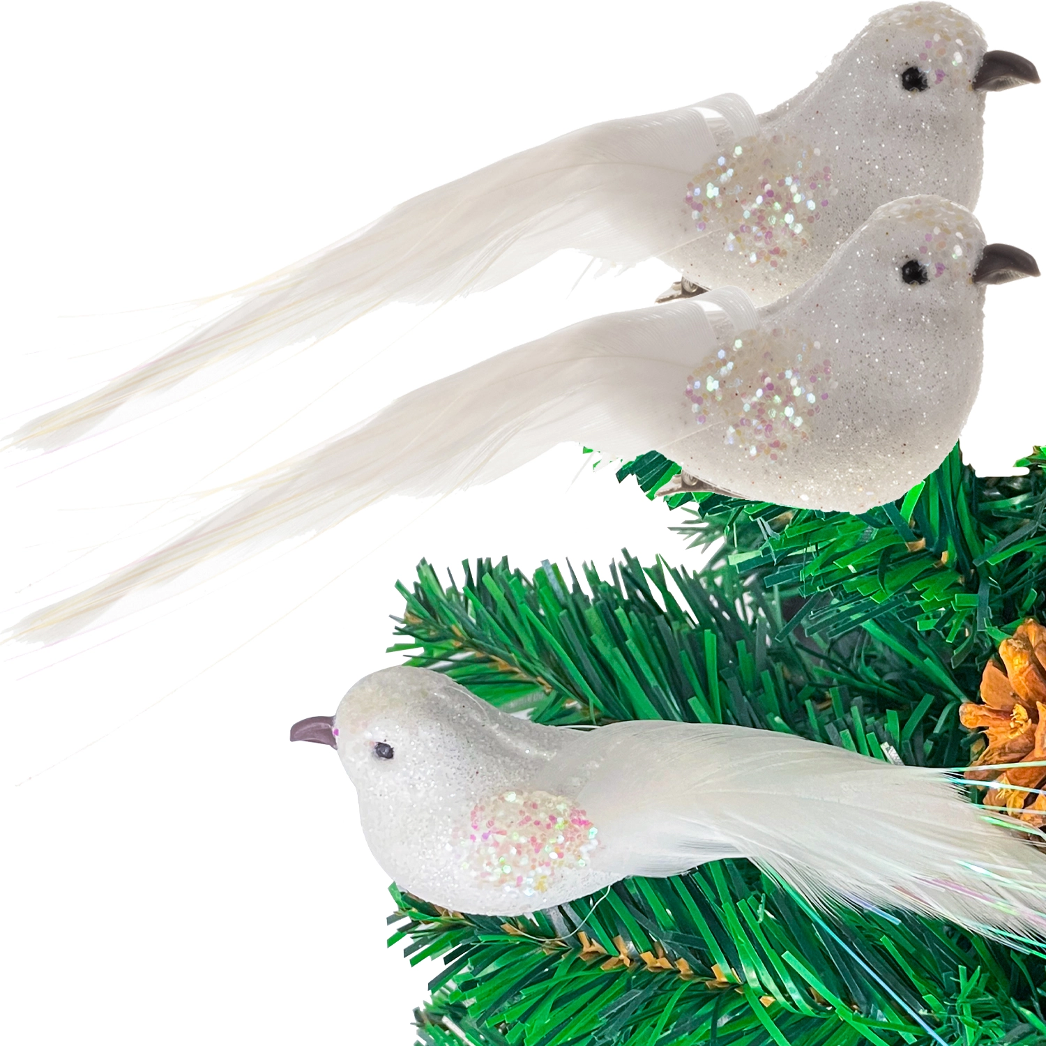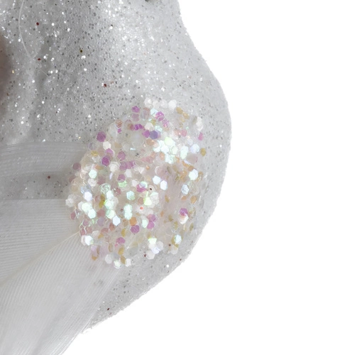 - 2 PTASZKI W ZESTAWIE – w zestawie są dwa ptaszki dekoracyjne. Ptaki są posypane delikatnie mieniącym się brokatem. Taki zestaw urozmaici Ci dekorację świąteczną, którą przygotujesz pod święta, ale Twoja dekoracja może być również na ślub lub inną okoliczność.