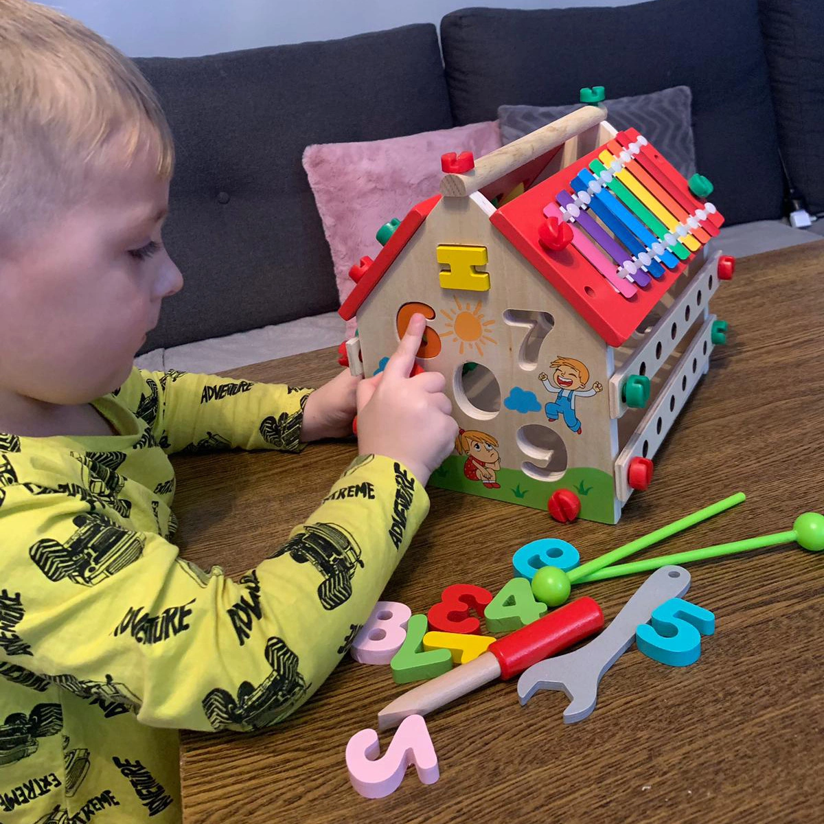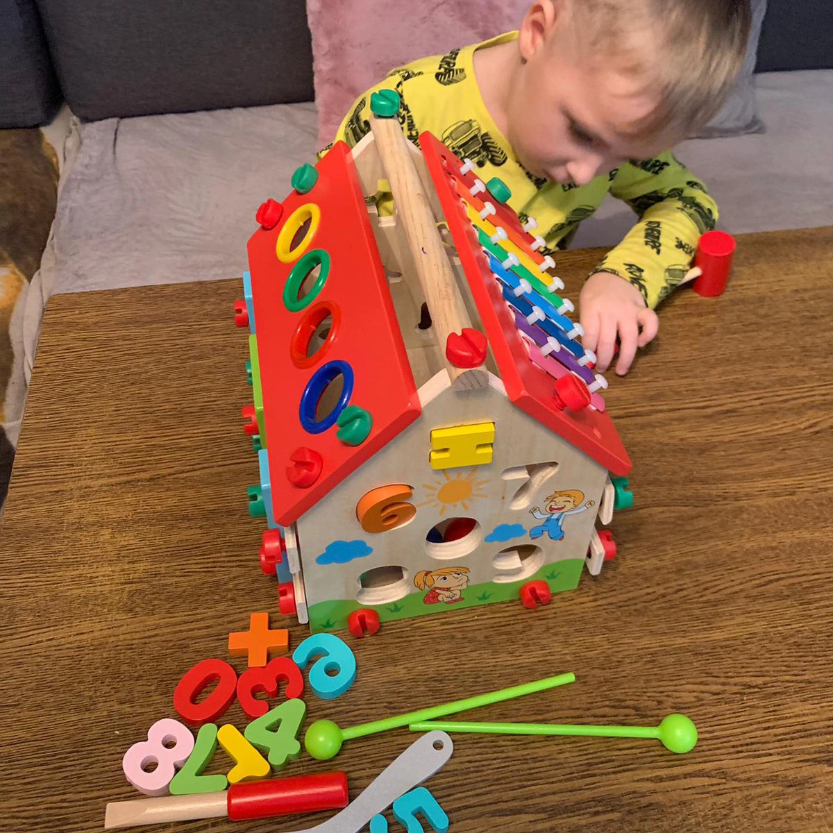 Sorter Drewniany Domek Edukacyjny Cyfry Kostka Cymbałki Kulki dla Dzieci KRUZZEL