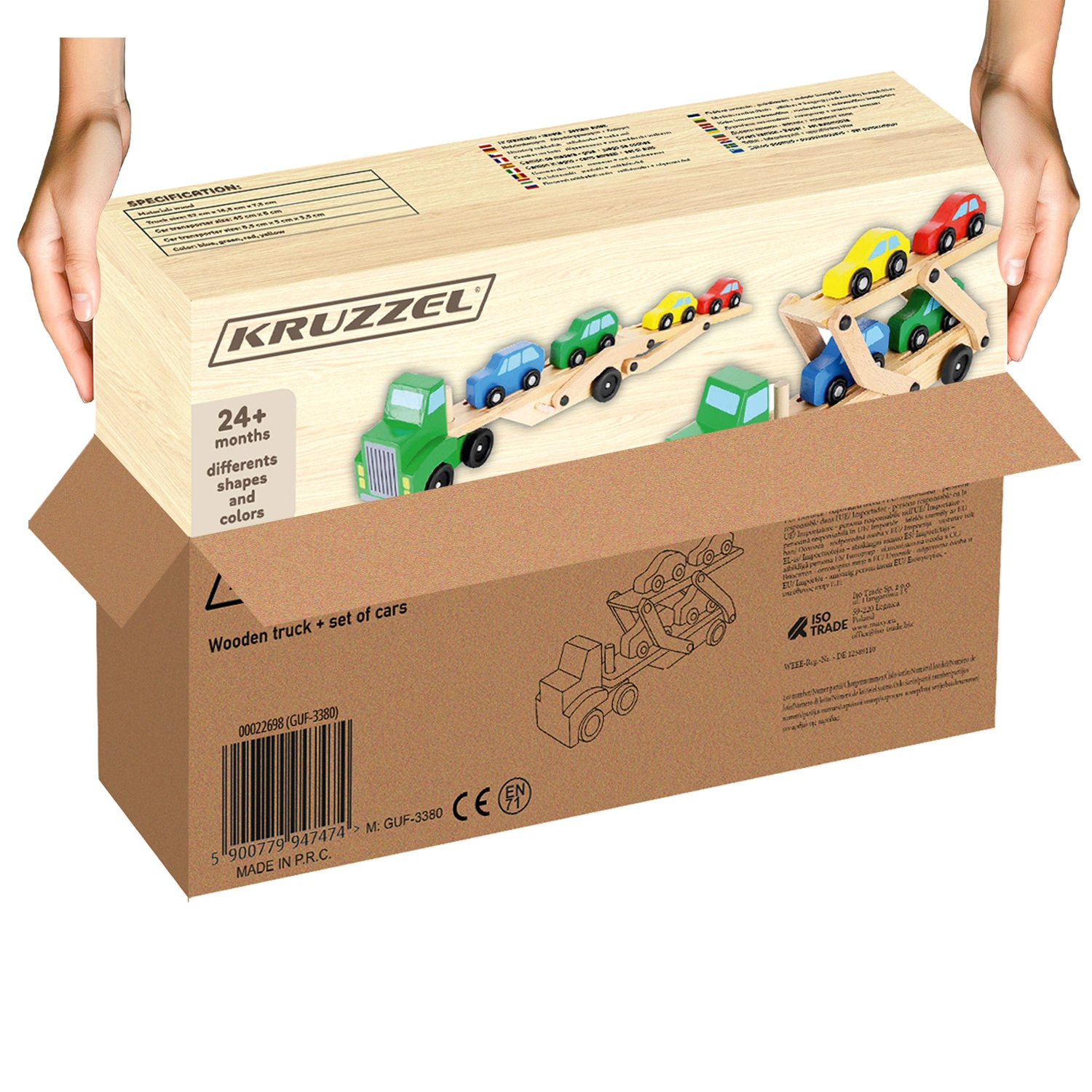 - DREWNIANA DWUPOZIOMOWA LAWETA + AUTKA - zestaw składa się z tira, doczepianej, ruchomej lawety oraz 4 samochodzików (czerwonego, niebieskiego, żółtego, zielonego) Posiada funkcję rozkładania, dzięki której samochodziki mogą bez problemu wjechać na lawetę.