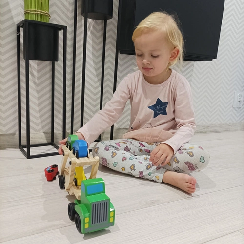 Drewniany tir z lawetą i samochodzikami to zabawka, która przypadnie do gustu każdemu małemu miłośnikowi motoryzacji. Dzięki niej maluch może przenieść się do świata pełnego samochodzików oraz ciężarówek i spędzić tam długie godziny radosnej zabawy. Laweta to pojazd, którego z pewnością nie może zabraknąć w żadnej samochodowej kolekcji. Dzięki niej pociecha może swobodnie przewozić pojazdy z pokoju do pokoju i poczuć się jak prawdziwy kierowca tira.