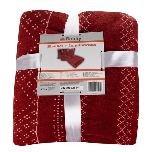 - SPECYFIKACJA: kolor: czerwony + biały; materiał: włókno poliestrowe + 2 poszewki dziane na poduszkę (włókno poliestrowe, zamek: nylon + ocynkowane żelazo); wymiary koc: 160 x 200 cm; wymiar poszewki: 40 x 40 cm waga: 1,011 kg; waga w opakowaniu: 1,052 kg.