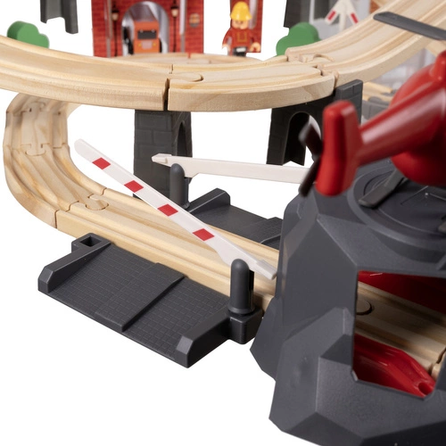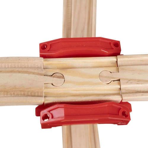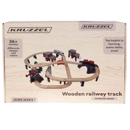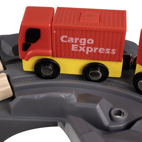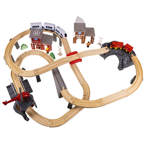 - SPECYFIKACJA – materiał dominujący: drewno, pozostałe: PP + ABS + żelazo + magnes + papier) – w zestawie 44 elementów toru, 2 drzewa, 2 znaki, 2 budynki, 2 barierki, 2 ludziki, 1 pociąg osobowy, 1 helikopter, 1 straż pożarna, 1 tir z naczepą ; zasilanie pociągu: 1 x AA (brak w zestawie); długość toru:4,8 m; wymiary platformy (most): cm; wymiary po rozłożeniu: 79 x 80 x 9 cm; waga: 2,148 kg; waga z opakowaniem: 2,290 kg.