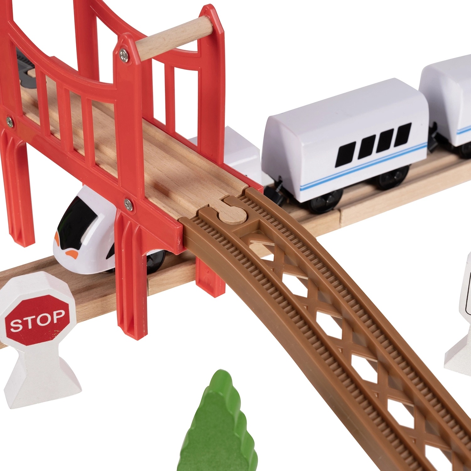 - SPECYFIKACJA – materiał dominujący: drewno, pozostałe: PP + ABS + żelazo + magnes) w zestawie - 20 elementów toru, 5 drzew, 2 znaki, 2 szlabany, 1 pociąg osobowy, 1 budynek policyjny, 1 samochodzik, 1 pachołek, 1 ludzik; zasilanie pociągu: 1x AA (brak w zestawie); ilość elementów w zestawie: 37; długość toru: 3,2 m; wymiary po rozłożeniu: 85 x 42 x 14,5 cm; waga:1,261 kg; waga z opakowaniem: 1,38 kg.