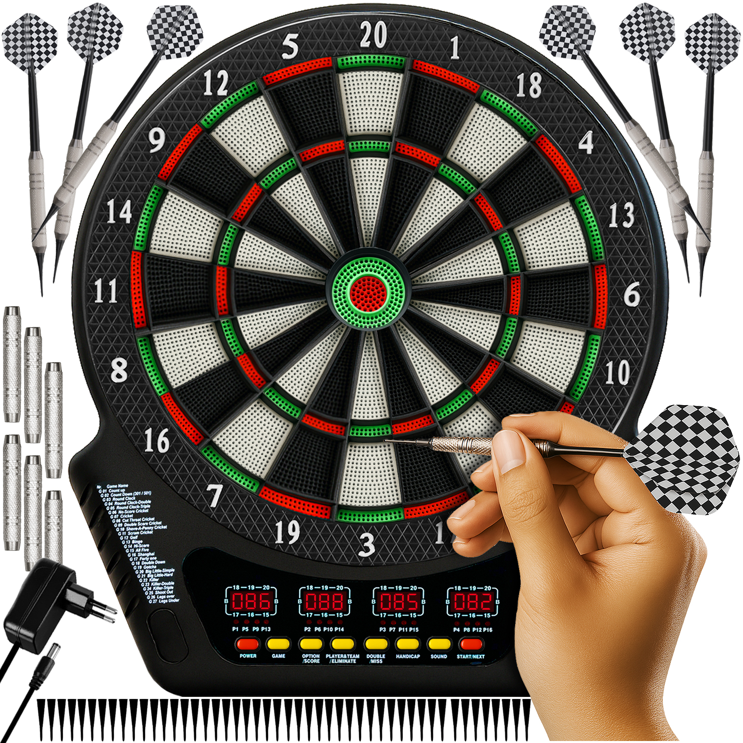 ✔️ kompletny zestaw - otrzymujesz pełen komplet: tarczę, 6 rzutek, 24 końcówki i zasilacz, co oznacza, że możesz zacząć grę od razu po rozpakowaniu – bez dodatkowych zakupów