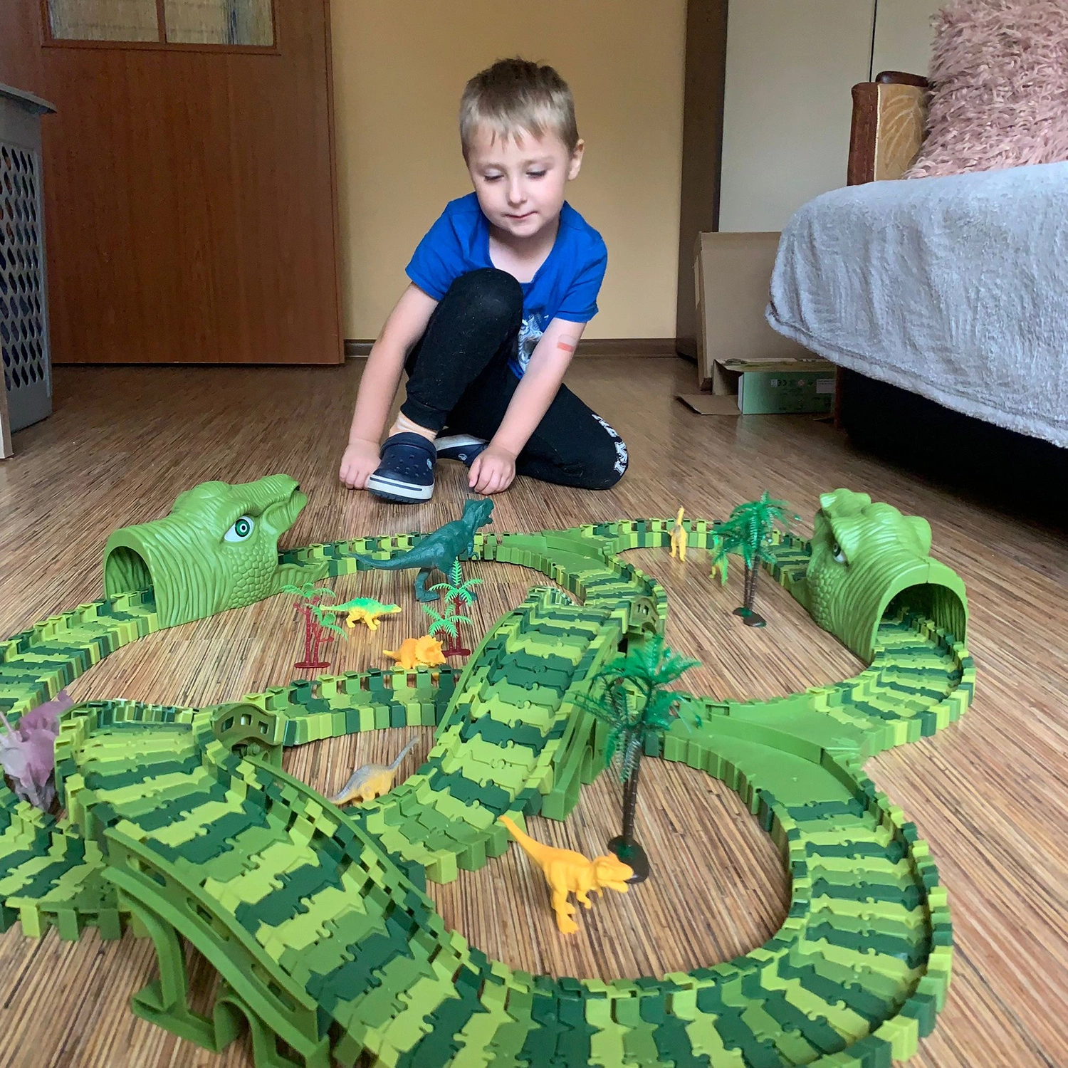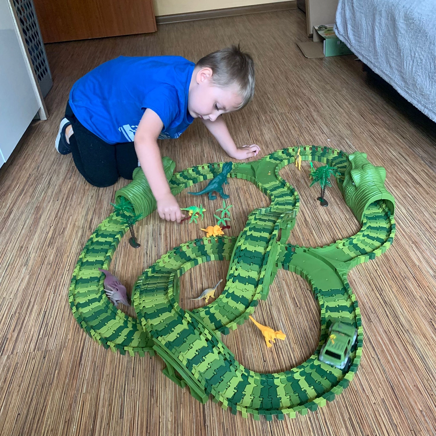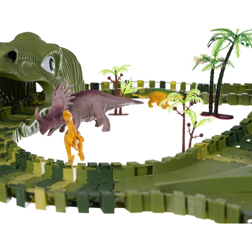 - ŁATWY W ZŁOŻENIU – tor składa się niesamowicie szybko i łatwo. Wystarczy wpinać wybrane kawałki jezdni do siebie za pomocą małych spinek umieszczonych z tyłu i z przodu elementów. Dziecko samo będzie mogło go zaprojektować i zbudować. Dodatkowym uatrakcyjnieniem zabawki są akcesoria rodem z prehistorii. Dziecko poczuje się jak turysta w prawdziwym parku dinozaurów.