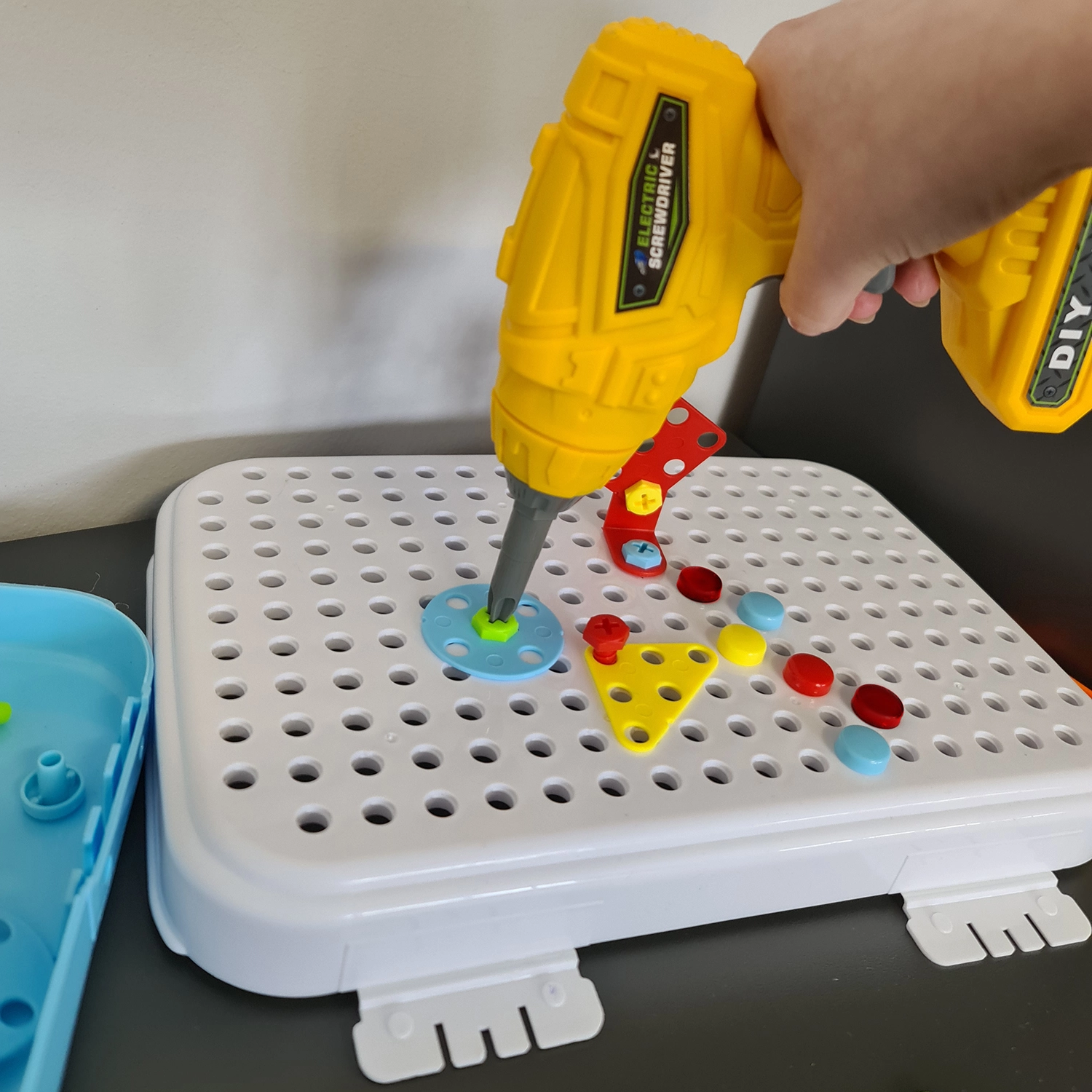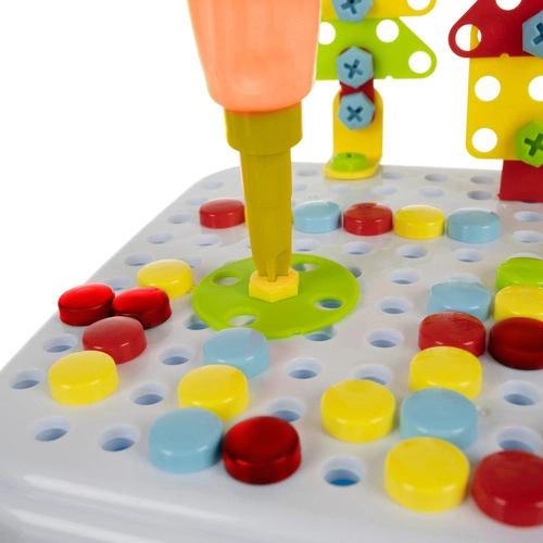 Kreatywna mozaika to wspaniały sposób na zabawę z całą rodziną. Umożliwi interesujące spędzenie czasu rodzica z dzieckiem w domu oraz przegoni nudę, zwłaszcza gdy pogoda na dworze nie sprzyja. Zestaw zawiera walizkę, na której na wierzchu znajduje się mozaika. Wewnątrz spakowana jest wiertarka wraz z końcówką, kolorowe podkładki. Wkrętarka zasilana jest bateriami, pozwala ona na wkręcani śrub!