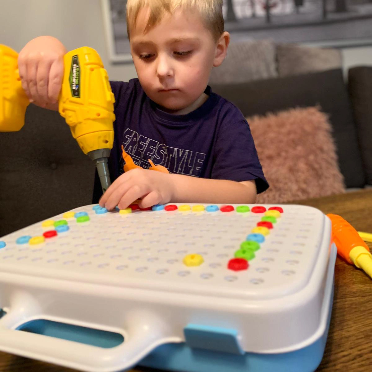 ✅ ROZWIJA I BAWI – zabawa z mozaiką to świetny sposób na rozwijanie zdolności manualnych, zręczności, ćwiczenie koordynacji wzrokowo-ruchowej oraz praktykowanie zdolności logicznego myślenia. Z zabawką dzieci ćwiczą również cierpliwość i koncentrację. Kreatywny sposób na wyśmienitą zabawę z rodzicami. Zabawa polega na układaniu obrazków / wzorów za pomocą wielu rożnych kształtów (prostokąt, kwadrat, koło, trójkąt). Wybrane elementy wkręca się za pomocą wkrętarki do podstawy walizki, na której znajdują się specjalne dziurki.