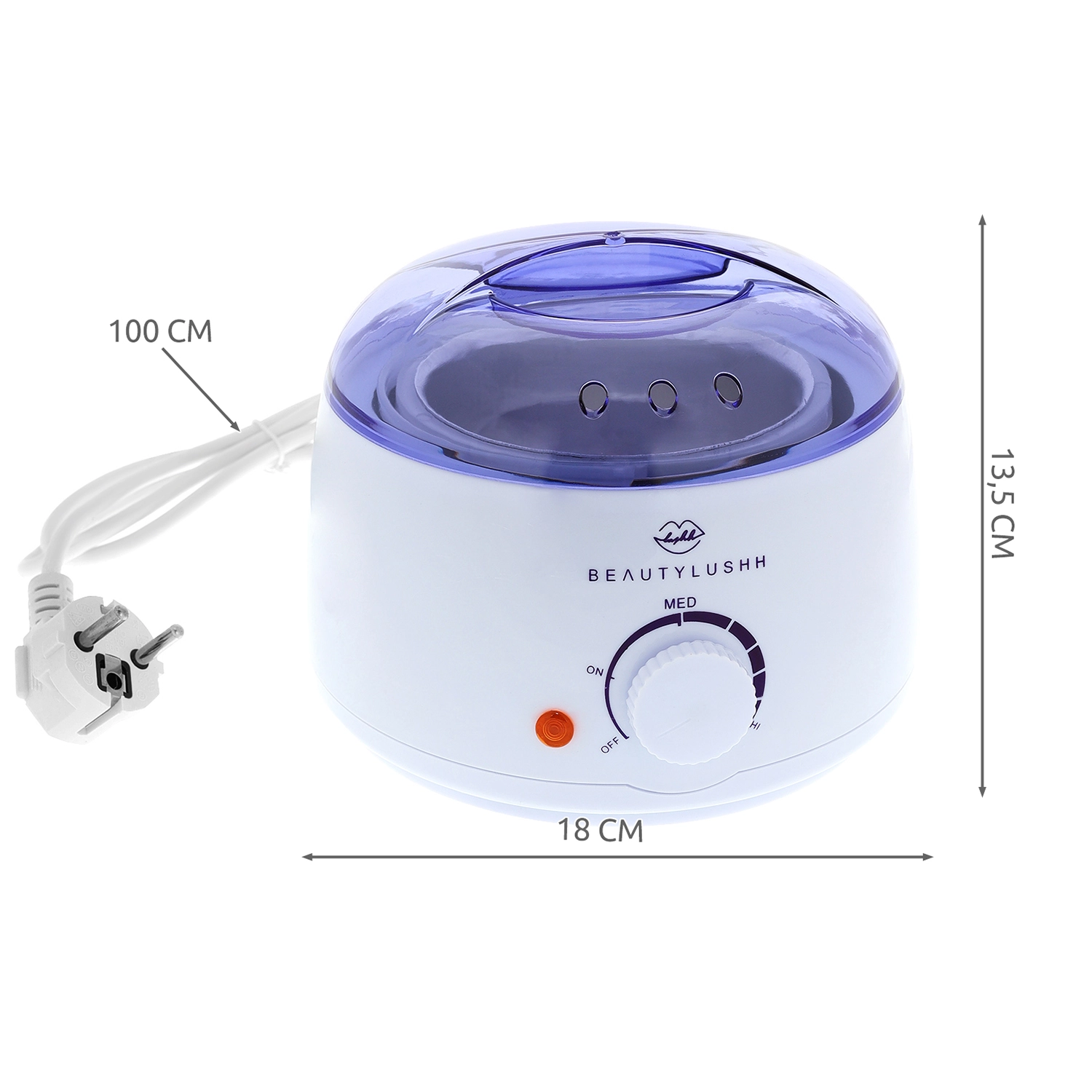 - REGULACJA TEMPERATURY – podgrzewacz posiada płynną regulację temperatury. Szybko rozgrzewa wosk, a dzięki pokrywce utrzymuje stałą temperaturę.