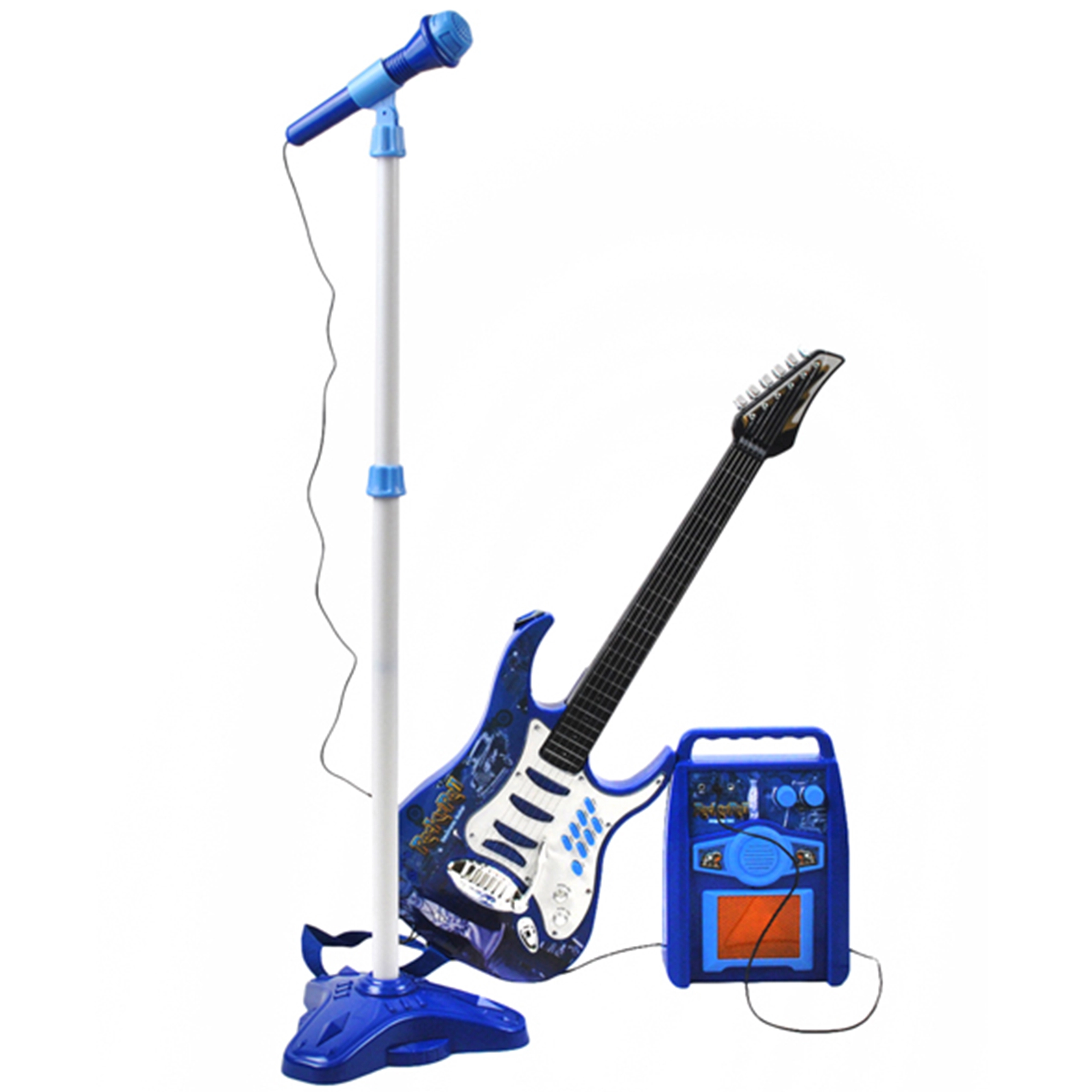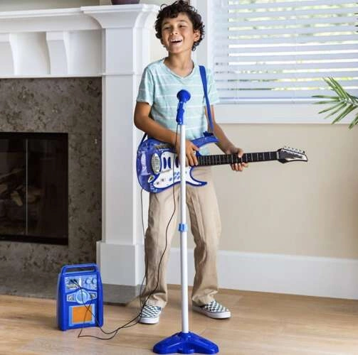 Rewelacyjna gitara elektryczna dla dzieci w komplecie ze wzmacniaczem i statywem z mikrofonem z pewnością spodoba się każdemu małemu miłośnikowi muzyki i występów przed publicznością. Cały zestaw jest niebieski, dlatego kolorystyka jest uniwersalna i przypasuje zarówno dla chłopców i dziewczynek. Gitara ze wzmacniaczem sprawi, że dziecko poczuje się niczym prawdziwy artysta na scenie niczym gwiazda na koncercie. Twoje dziecko z gitarą i mikrofonem będzie tworzyć wspaniałe melodie i śpiewać do nich piosenki. Szalonemu koncertowi towarzyszą migające światełka w gitarze i wzmacniaczu.
