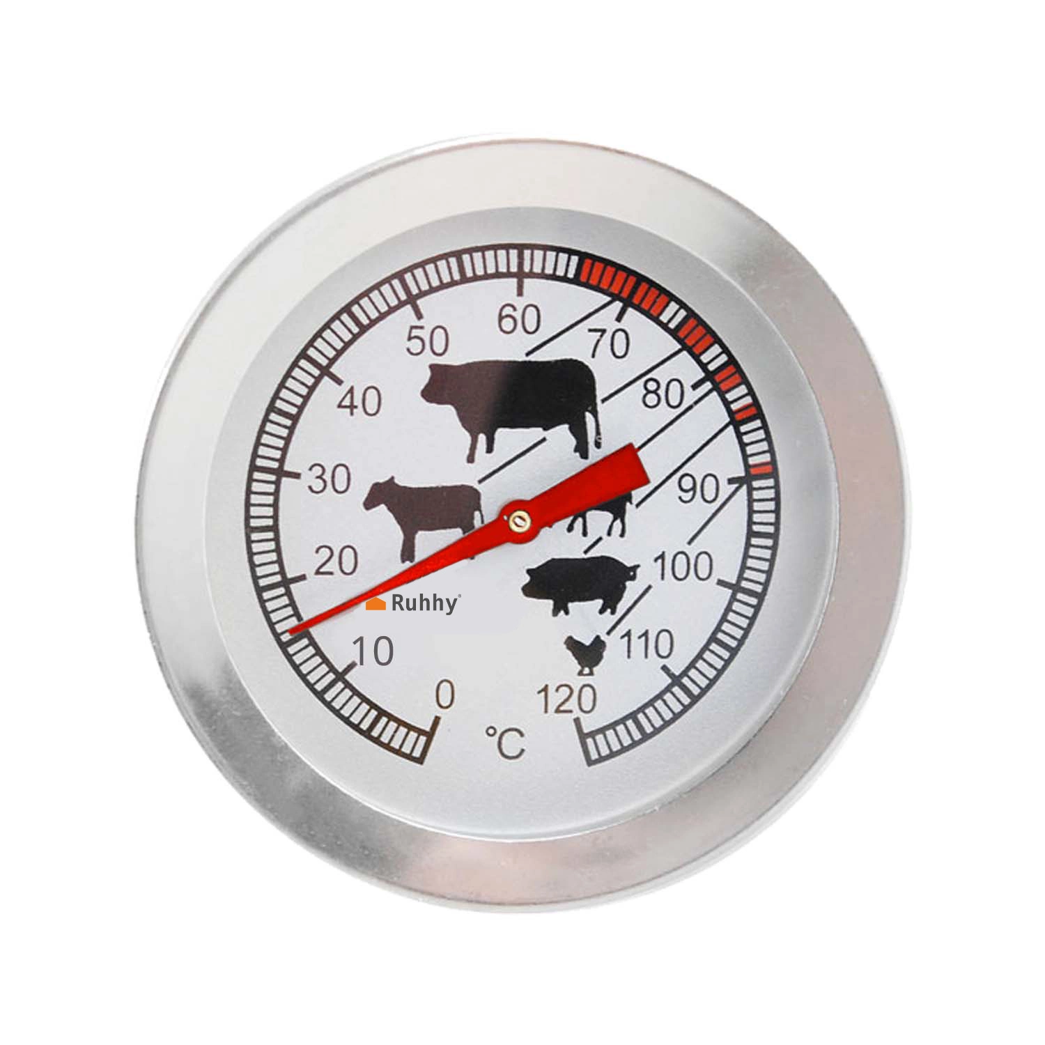 - CZYTELNA I PRAKTYCZNA TARCZA – termometr posiada praktyczne symbole optymalnych temperatur wędzenia dla określonego typu mięsa (wołowina, baranina, cielęcina, wieprzowina i drób). Tarczę jest czytelna, dzięki temu odczyt temperatury jest szybki i wygodny. Skala pokazuje w stopniach Celsjusza co 10 stopni.