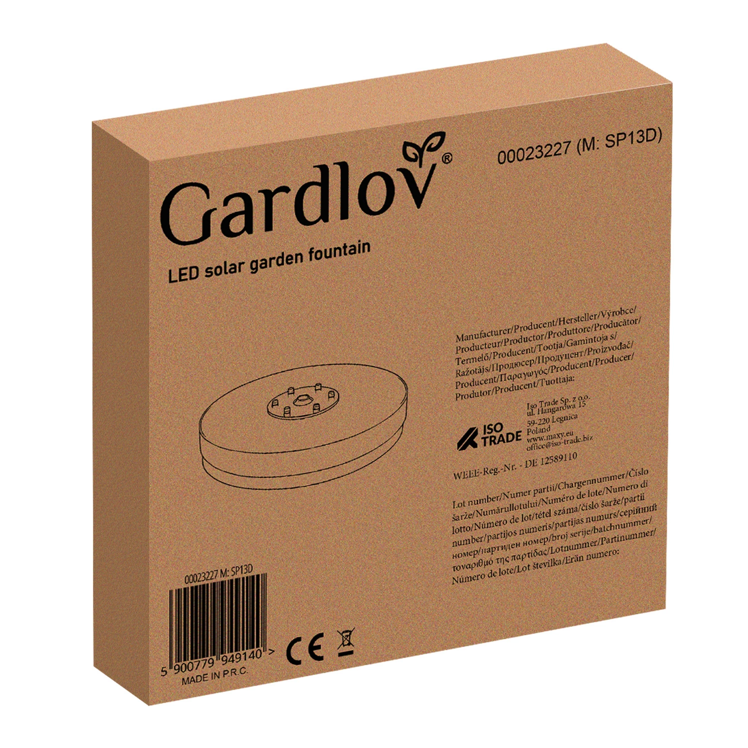 - SPECYFIKACJA - producent: Iso trade; marka: GARDLOV; kolor: czarna; liczba diod 6; światło LED RGB; płyta słoneczna: 7V i 3W; czujniik zmierzchu: tak; wyjście pompy wodnej: DC 4,5-12V; maksymalny przepływ wody: 180l/h; maksymalna wysokość natrysku: 30 - 60 cm; pojemność baterii: 3,7 V/900 mAh; wymiary: 16 cm x 4 cm; waga: 340 g; waga w opakowaniu: 434 g.