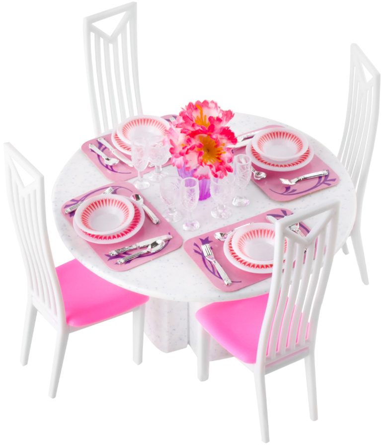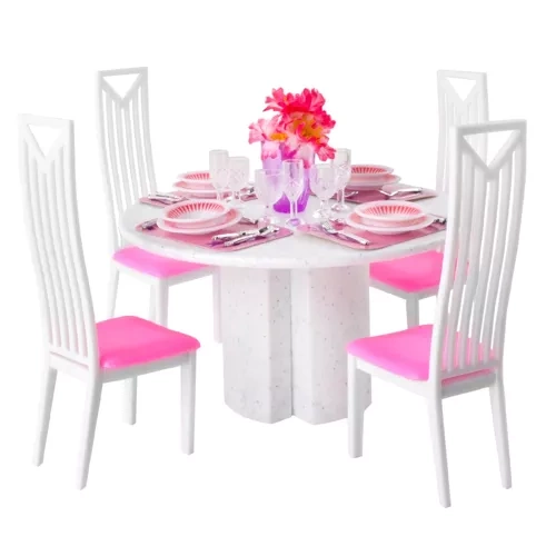 - DUŻY ZESTAW – w zestawie znajduje się stół z 4 krzesełkami, zestaw talerzy oraz komplet sztućców, 8 kieliszków do wina, a także dekoracyjny wazon z kwiatkami. Całość umożliwia kreatywne wykorzystanie i interesującą zabawę.