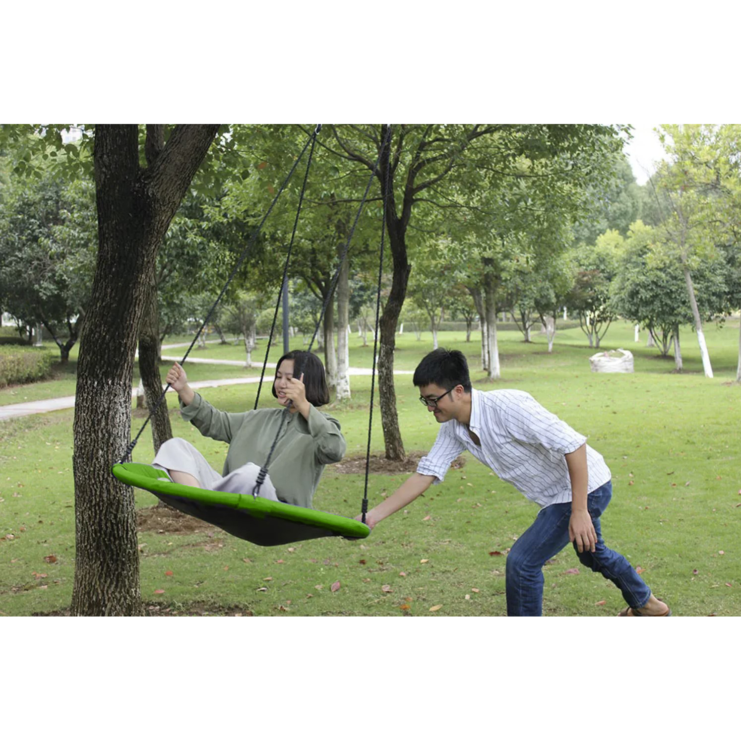 ✓ OBSZERNE SIEDZISKO – huśtawka posiada szerokie, okrągłe siedzisko zbudowane ze stalowej ramy zabezpieczonej pianką EPE, wewnątrz której znajduje się mocna siatka PP. Wykonane zostało z tkaniny Oxford 600D, dzięki czemu gwarantuje bezpieczna zabawę. Udźwig do 150 kg możliwy jest dzięki zastosowaniu lin plecionych o grubości 10mm. Gwarantuje to bezpieczeństwo i pozwala na chwile radości nawet dorosłym. Jest idealnym rozwiązaniem dla dużej rodziny. Jej wielkość oraz kształt sprawiają, że zmieści się na niej kilka osób.