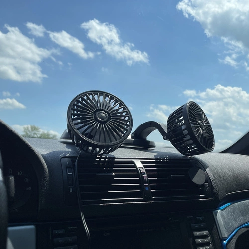 Wiatrak samochodowy 12V posiada dwie niezależne, obrotowe głowice, które można ustawić w różnych kierunkach. Dzięki temu zarówno kierowca, jak i pasażerowie mogą korzystać z nawiewu według własnych potrzeb – to rozwiązanie idealne na upalne dni i długie podróże!