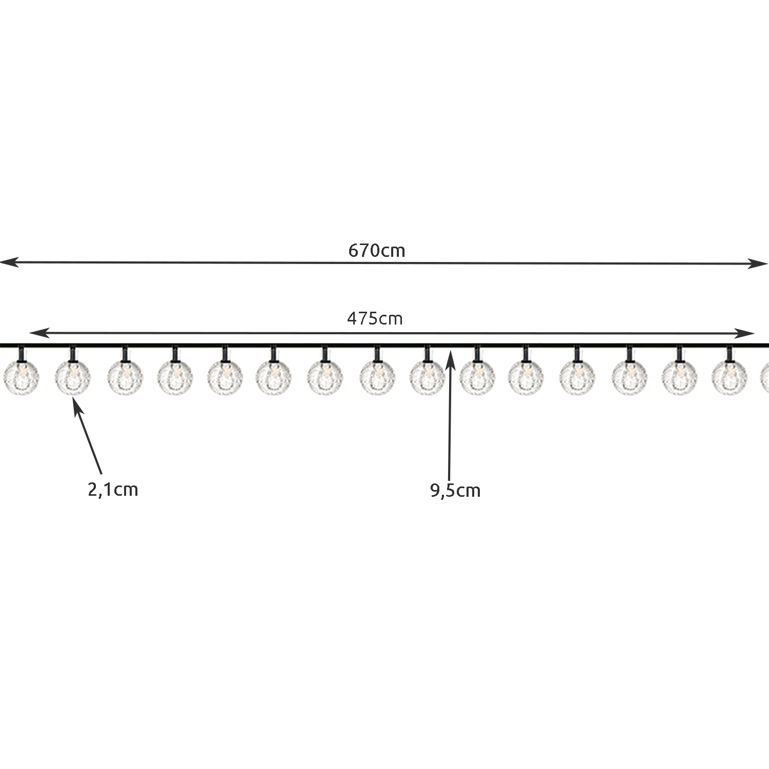 - CIEPŁE, ŻÓŁTE ŚWIATŁO - Kulki w girlandzie emitują ciepły biały kolor światła, co sprawia, że idealnie nadają się do tworzenia nastrojowego oświetlenia. Każda kula jest rozmieszczona w odległości 9,5 cm od siebie, co zapewnia równomierne rozłożenie światła na całej długości girlandy. Przemyślany design girlandy dopełnia długi na 700 cm kabel w ciemnozielonym kolorze, który doskonale wtapia się w otoczenie, stając się niemal niewidoczny na tle roślinności, co pozwala skupić całą uwagę na świecących kulach.