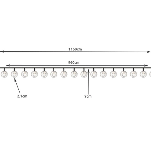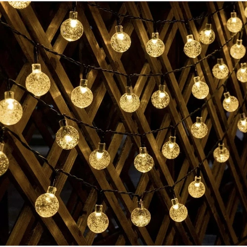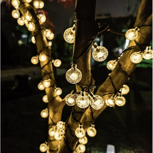 - SPECYFIKACJA: materiał: PS, ABS, PVC, silikon; kolor: ciepły biały; ilość trybów świecenia: 8; odległość między kulami: 9 cm; panel solarny: 3 V 800 mAh; bateria 800 mAh; wodoodporność: IP44; ilość kulek: 100; czas ładowania/ pracy: 10h; długość całkowita: 1160 cm; długość przewodu z lampkami: 960 cm; średnica kulki: 2,1cm; waga: 0,830 kg; waga w opakowaniu: 0,9 kg
