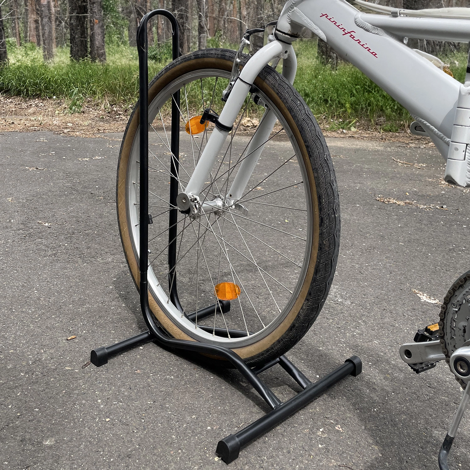 - SPECYFIKACJA – materiał: stal, pozostałe: guma; kolor: czarny; wielkość koła: 16-29"; składany: z 2 części; proste parkowanie: przodem lub tyłem; wolnostojący; jednostanowiskowy; antypoślizgowe stopki; odległość między rurkami: 6,5 cm; wymiary: 71 x 40 x 37 cm; waga: 1 kg; waga w opakowaniu: 1,6 kg.