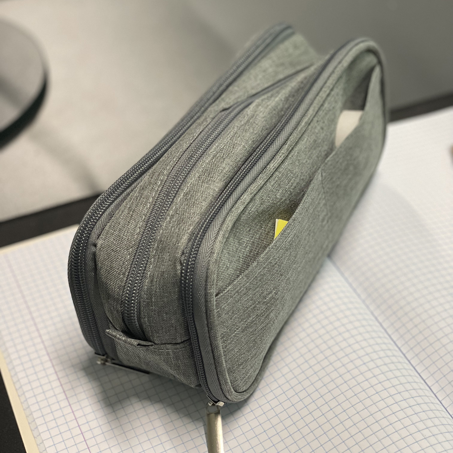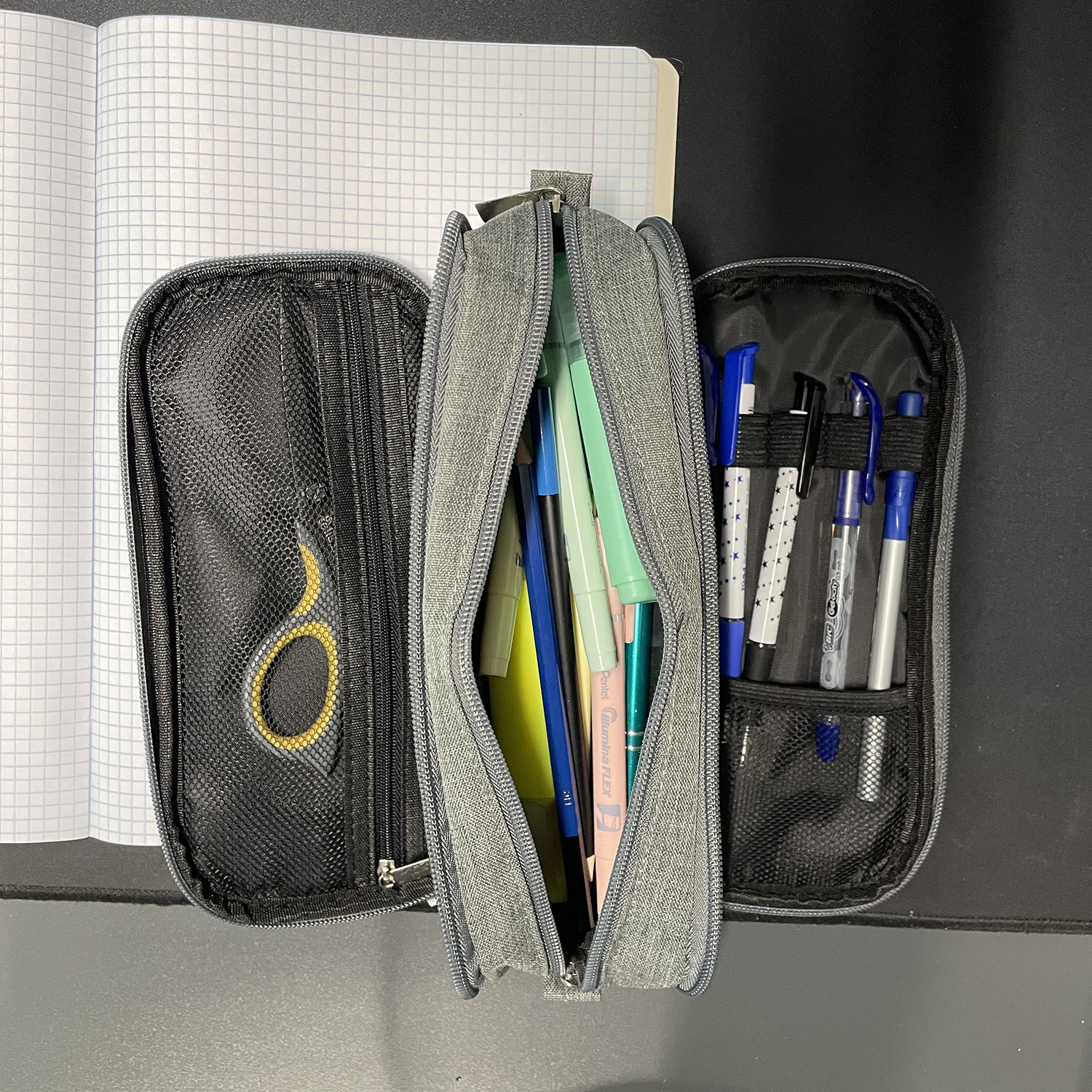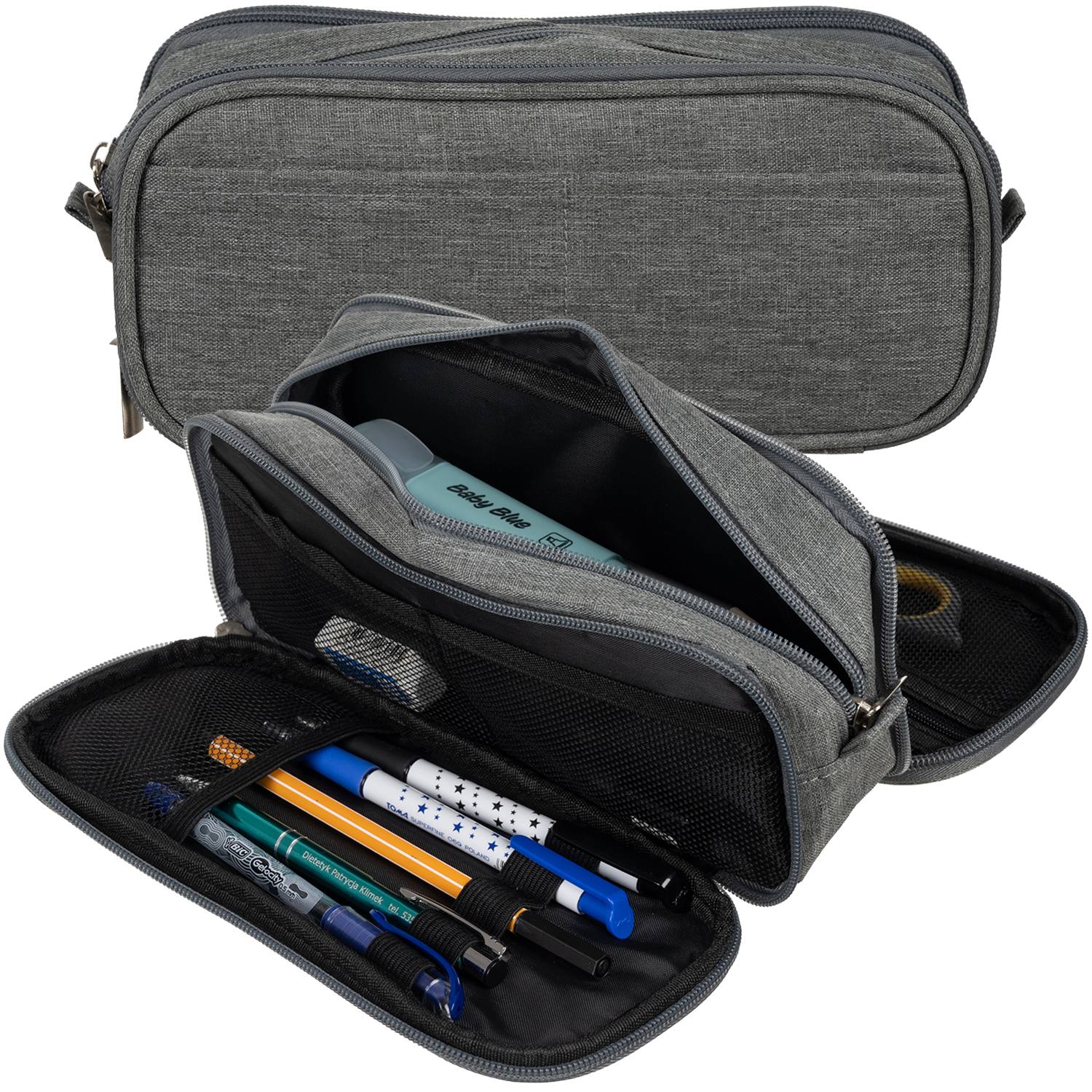 - STYLOWY DESIGN - trzykomorowy piórnik wyróżnia się eleganckim wyglądem i nowoczesnym designem. Wykonany z wytrzymałego materiału piórnik zapewnia nie tylko długotrwałe użytkowanie, ale także estetyczny wygląd. Świetnie odzwierciedli osobowość i styl użytkownika. Jego elegancki wygląd, szary kolor oraz zewnętrzna kieszonka sprawiają, że sprawdzi się również jako kosmetyczka.