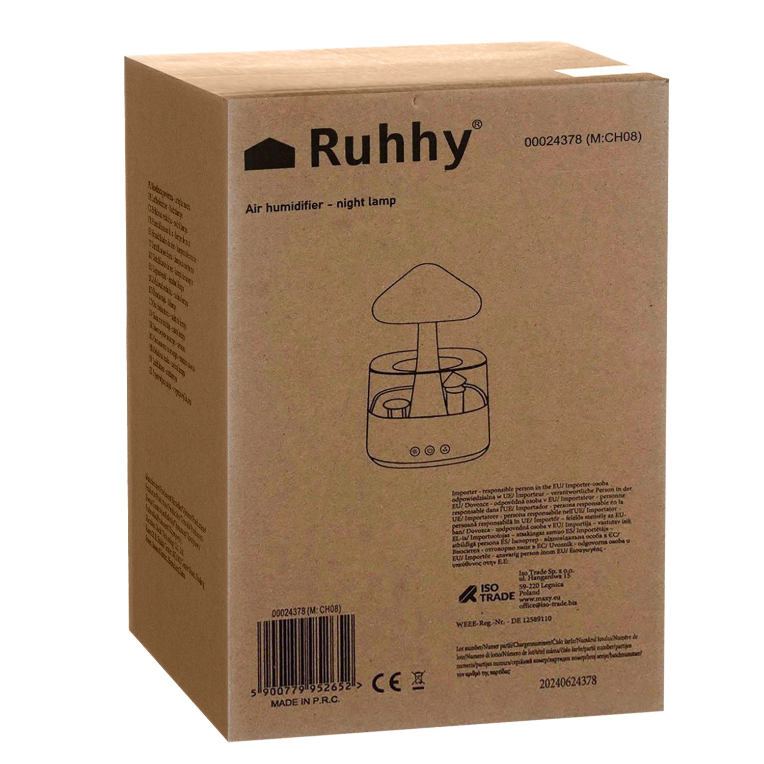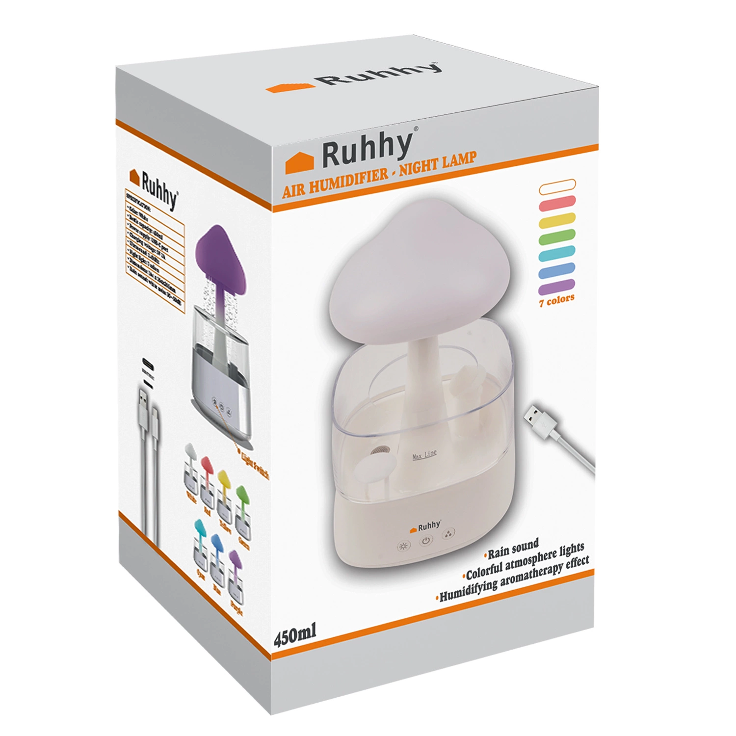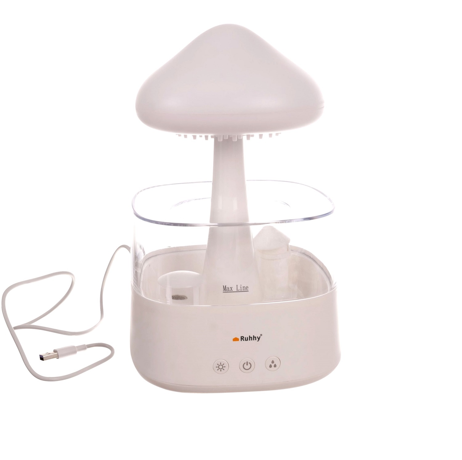 - SPECYFIKACJA – kolor: biały; materiał: PP, pozostałe: PC + silikon + stal nierdzewna + ABS; moc: 10 W; efekt deszczu: tak; nawilżanie: tak; pojemność: 450 ml; 8 kolorów świecenia; ilość LED: 6; antypoślizgowa obręcz z silikonu pod spodem: tak; długość przewodu zasilającego: 100 cm; wymiary: 26 x 16 x 16 cm; waga: 0,6 kg; waga w opakowaniu: 1,2 kg.