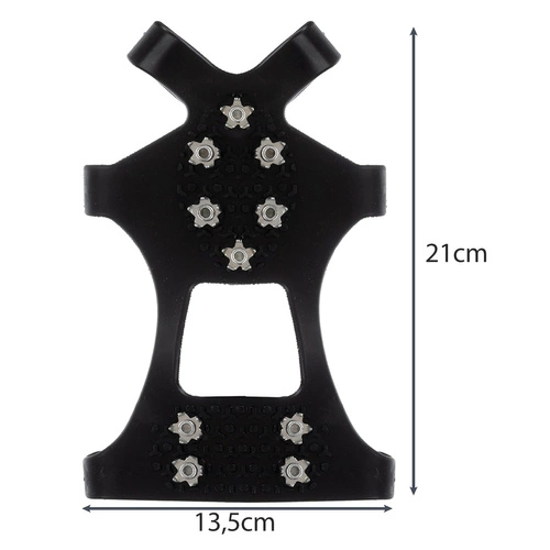 - SPECYFIKACJA - kolor: czarno / srebrne; materiał: TPE / metal; ilość zębów w 1 raku: 10; ilość kolców w 1 raku: 50; rozmiar: L 40-44; grubość gumy: 0,3 cm; wysokość kolca: 3,5 mm; wymiary na płasko: 21,5 x 13,5 cm; waga: 0,171 kg; waga z opakowaniem: 0,194 kg.