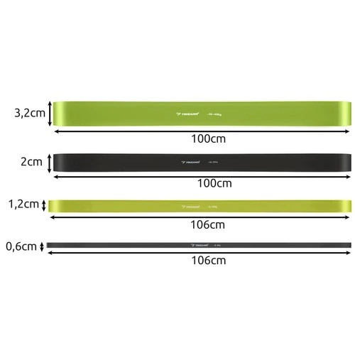- SPECYFIKACJA - kolor: zielony / czarny / szary; materiał: lateks, poliester, EVA, PP, POM; rodzaj: power band; grubość: 4 mm; waga zestawu: 0,67 kg; waga w opakowaniu: 0,75 kg.