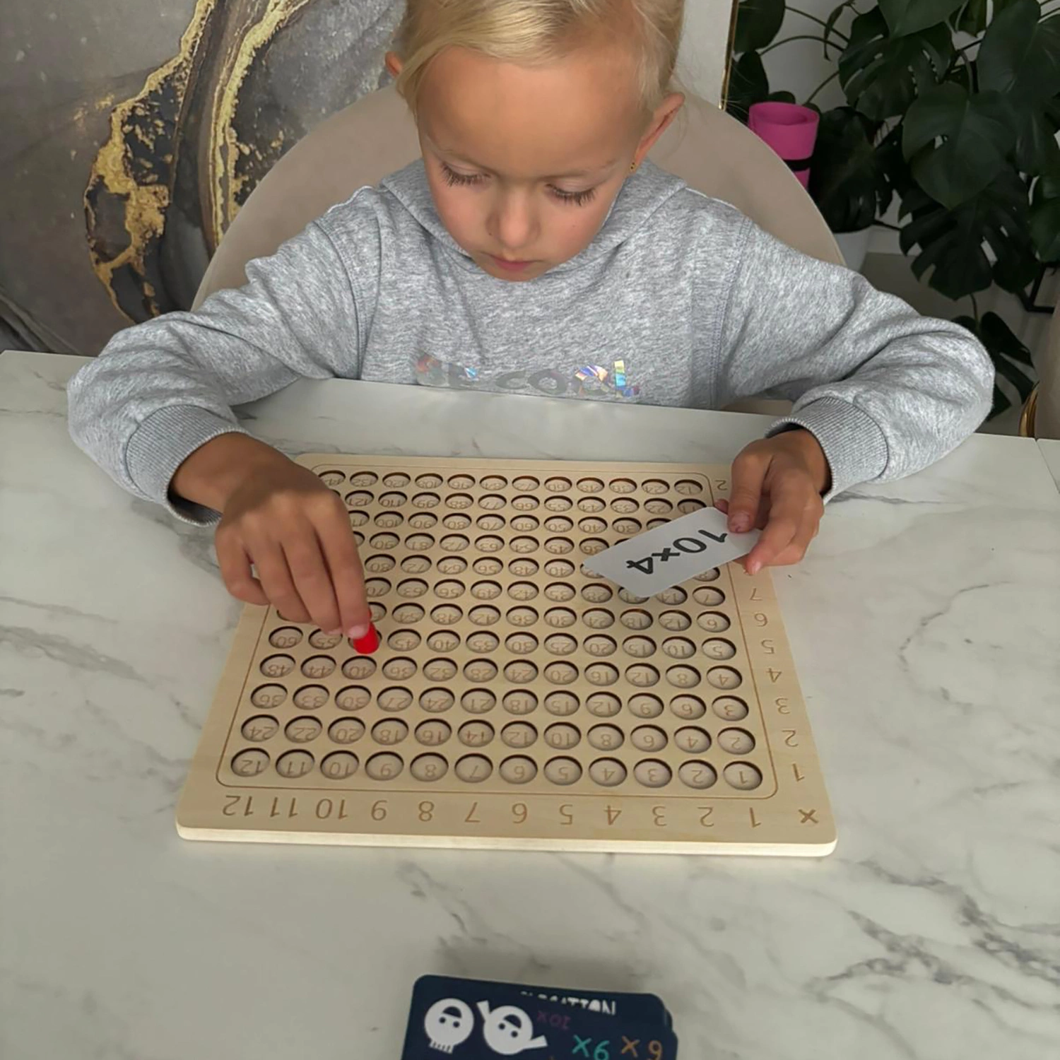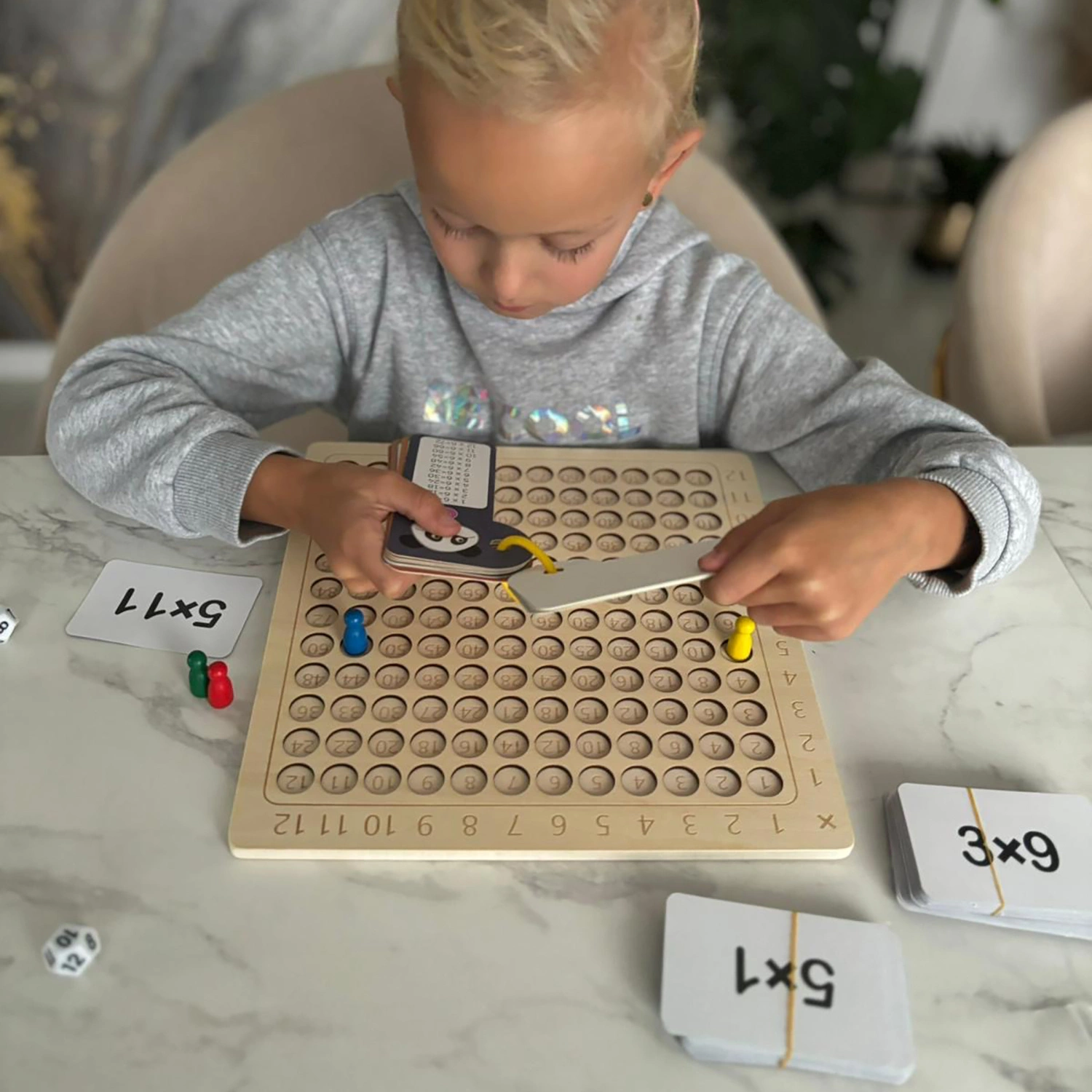 - FUNKCJONALNE KARTY I AKCESORIA - zestaw zawiera 144 papierowe karty pokryte laminatem, co czyni je wodoodpornymi oraz odpornymi na zniszczenia. Karty z jednej strony mają przykłady mnożenia, a z drugiej atrakcyjną, kolorową grafikę, co uatrakcyjnia zabawę. Ponadto w grze znajdują się 4 drewniane pionki, malowane proszkowo, które można ustawiać na planszy. Gra zawiera także dwie dwunastościenne kostki, na których cyfry są wyżłobione i pomalowane, co zapobiega ich ścieraniu.