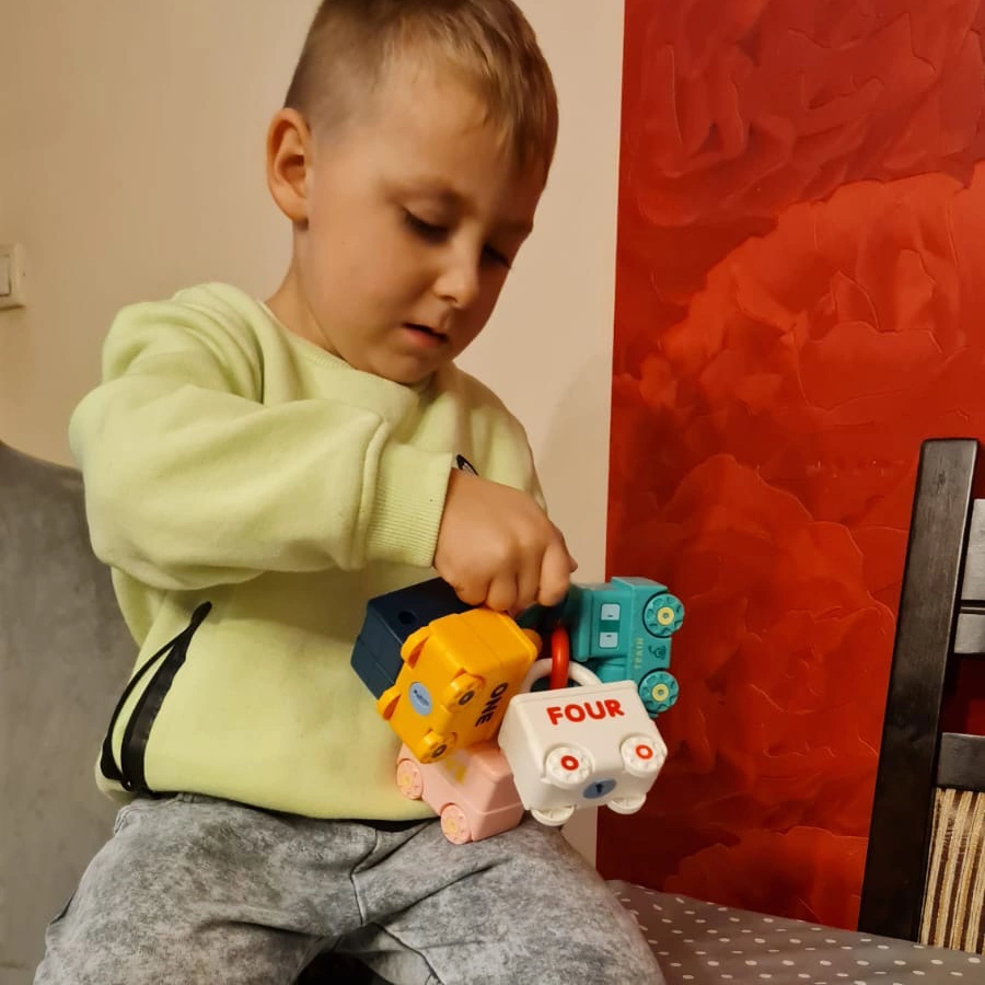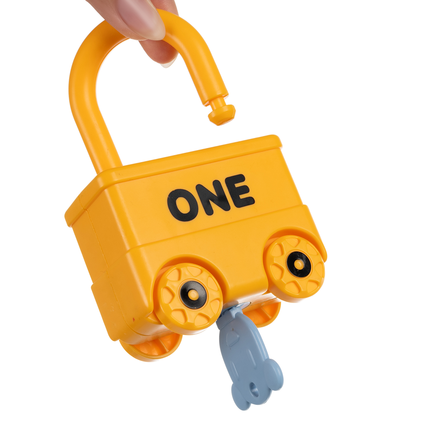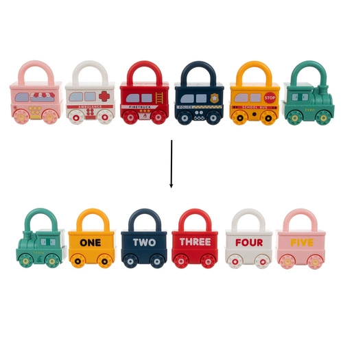 - ZESTAW Z 6 RÓŻNYMI SAMOCHODZIKAMI - układanka samochodziki to zestaw składający się z sześciu różnych pojazdów: lokomotywy oraz pięciu autek w kształcie prostokątnych kłódek. Lokomotywa, oznaczona jako „Train”, ma na jednym boku napis „Zero”, a każdy kolejny pojazd reprezentuje numery od 1 do 5, oraz angielskie nazwy: „School Bus”, „Police”, „Firetruck”, „Ambulance” i „Ice Cream”. Dzięki temu zestaw nie tylko rozwija wyobraźnię, ale też pomaga dzieciom zapoznać się z liczbami oraz językiem angielskim. Od spodu samochodziki posiadają dziurki na kluczyk, po jego przekręceniu otwiera się kłódka – samochodzik. Górną, odpinaną część można obracać o 360°.