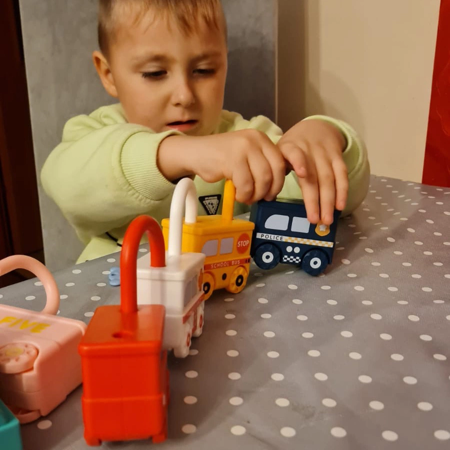 - ŁĄCZENIE POJAZDÓW - samochodziki mogą być pojedynczymi pojazdami a dzięki ruchomym uchwytom, które obracają się o 360 stopni, można je łączyć w długi pociąg z wagonikami. Po otwarciu kłódek za pomocą odpowiednich kluczyków, dzieci mogą połączyć pojazdy w odpowiedniej kolejności, tworząc długi ciąg. Taka forma zabawy stymuluje wyobraźnię dziecka, a jednocześnie uczy logicznego myślenia oraz porządkowania według kolejności.