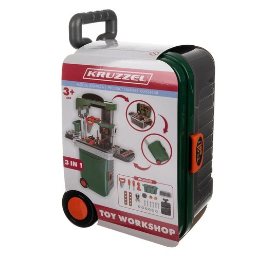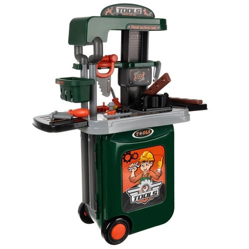 ✔️ łatwość montażu i wygodne przechowywanie - warsztat można łatwo złożyć i rozłożyć, a po zabawie wszystkie narzędzia mieszczą się w walizce na kółkach z zamykanym zatrzaskiem