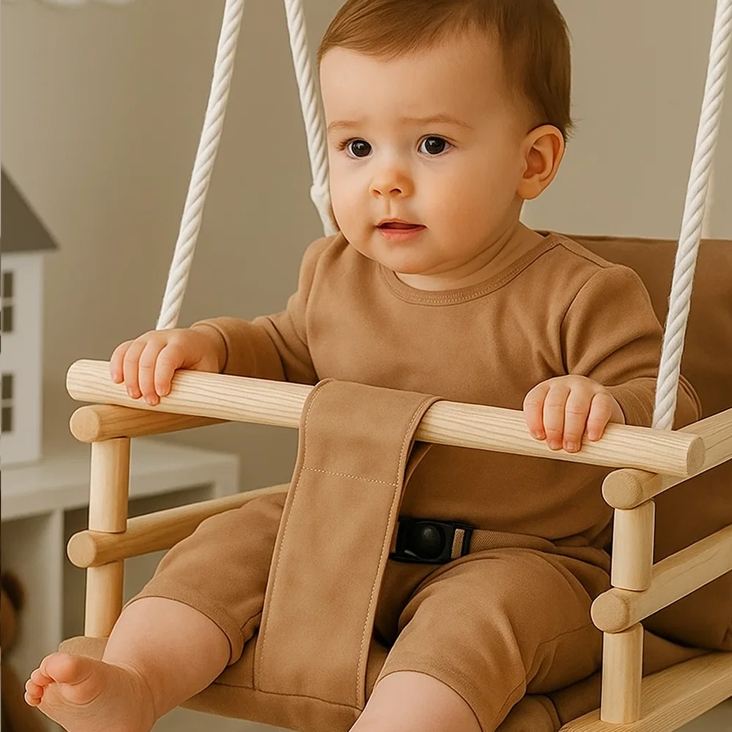 ✅ Huśtawka w zgaszonym beżowym kolorze – elegancka i bezpieczna zabawa!