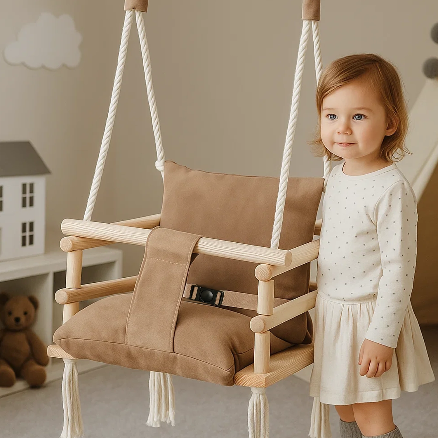 Zachwycająca huśtawka dla malucha w subtelnym beżowym kolorze to połączenie elegancji i bezpieczeństwa. Idealna do pokoju dziecka lub ogrodu, nie tylko będzie pięknie się prezentować, ale także zapewni komfortową zabawę, dając maluchowi mnóstwo radości i przyjemności w bezpiecznym otoczeniu.
