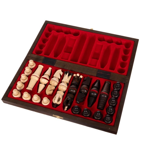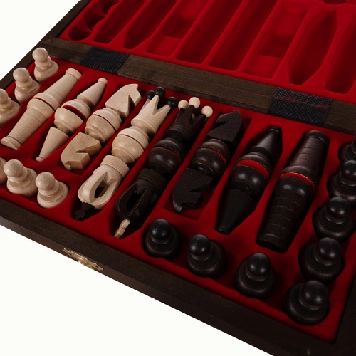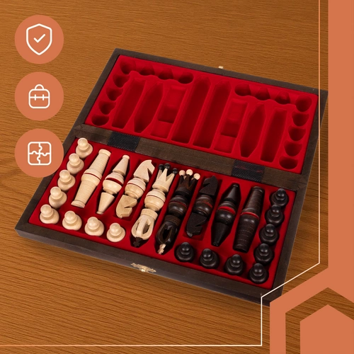 W zestawie znajdziesz flokowane wkładki, które idealnie dopasowują się do każdej figury i pionka. Dzięki nim elementy gry nie przemieszczają się w trakcie transportu, co zapobiega ich uszkodzeniu. To praktyczne i eleganckie rozwiązanie, które dba o porządek i trwałość szachów.