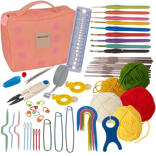 ✔️ zawiera wszystko, co potrzebne - oprócz 21 szydełek w różnych rozmiarach znajdziesz także markery do oczek, igły dziewiarskie, 5 motków włóczki, uchwyty na oczka, narzędzia do robienia pomponów, taśma miernicza, obcinaczki i inne akcesoria – aż 58 elementów! Nie musisz niczego dokupować – możesz od razu zacząć tworzyć