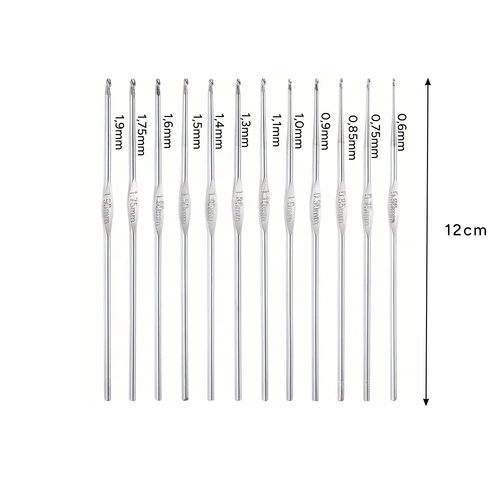 - 12 szydełek metalowych z wygodną kolorową rękojeścią: 0.6, 0.75, 0.85, 0.9, 1.0, 1.1, 1.3, 1.4, 1.5, 1.5, 1.75, 1.9 mm