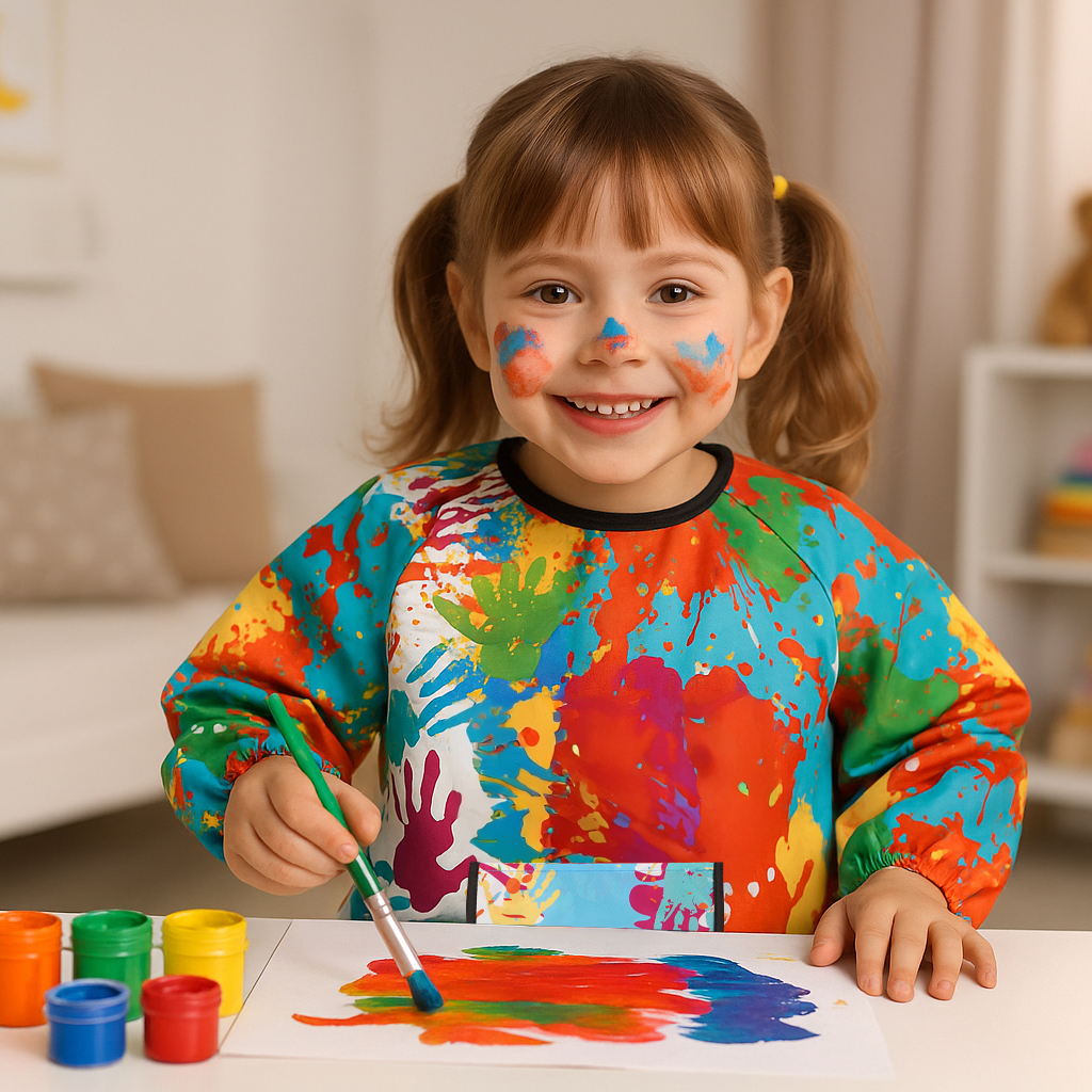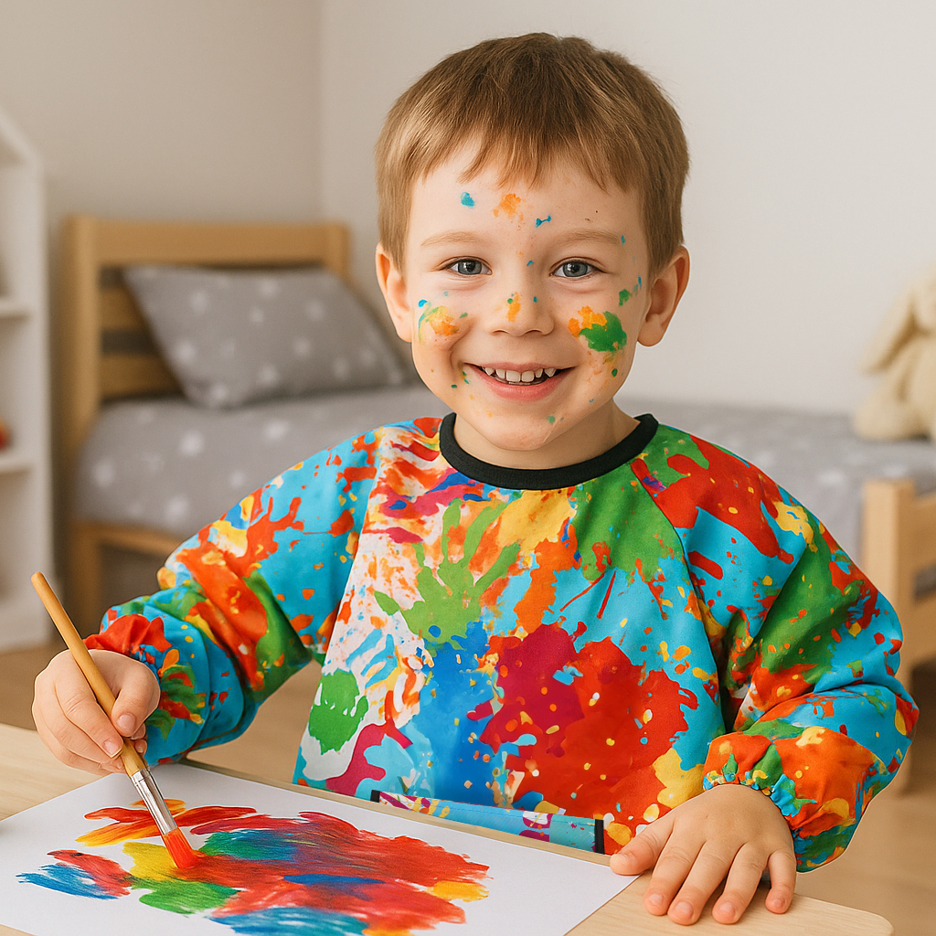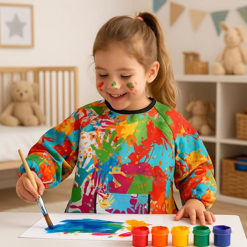 Długie rękawy z gumkami idealnie dopasowują się do rączek dziecka, chroniąc przed farbą aż po nadgarstki. Zapobiegają zsuwaniu się i sprawiają, że dziecko swobodnie się porusza.