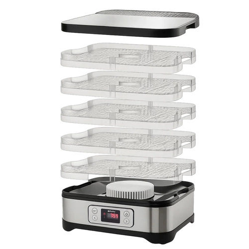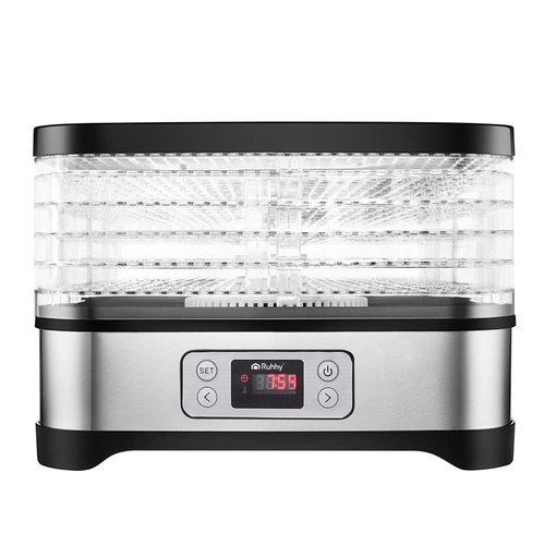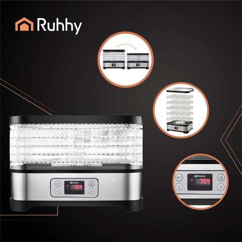 Uniwersalna suszarka RUHHY o mocy 400 W umożliwia suszenie grzybów, owoców, warzyw i ziół – ma aż 5 tacek o łącznej pojemności 10 litrów, regulowaną temperaturę (35–70°C) oraz czytelny wyświetlacz z programatorem do 24 godzin. W zestawie znajdują się również tacki do płynnych produktów, siatki i maty nieprzywierające – dla maksymalnej wygody. Energooszczędna i wykonana z bezpiecznych materiałów BPA FREE – idealna do domowej spiżarni przez cały rok.