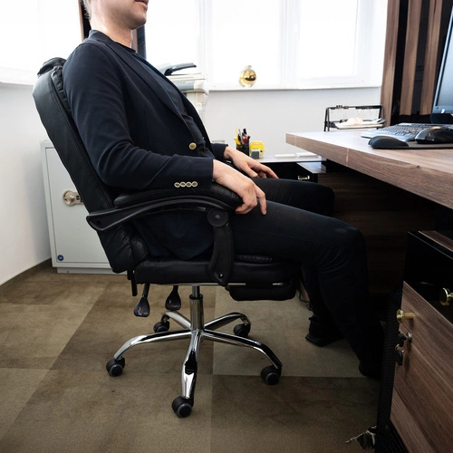 Komfortowy fotel biurowy posiada wysuwany podnóżek – komfort i ulga dla nóg w każdej chwili