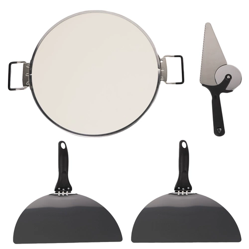 w zestawie: piec do pizzy, kamień ceramiczny do pizzy z uchwytami, 2 łopatki, nóż 2w1, instrukcja obsługi, styropianowe zabezpieczenia, kolorowe opakowanie, brązowy karton transportowy