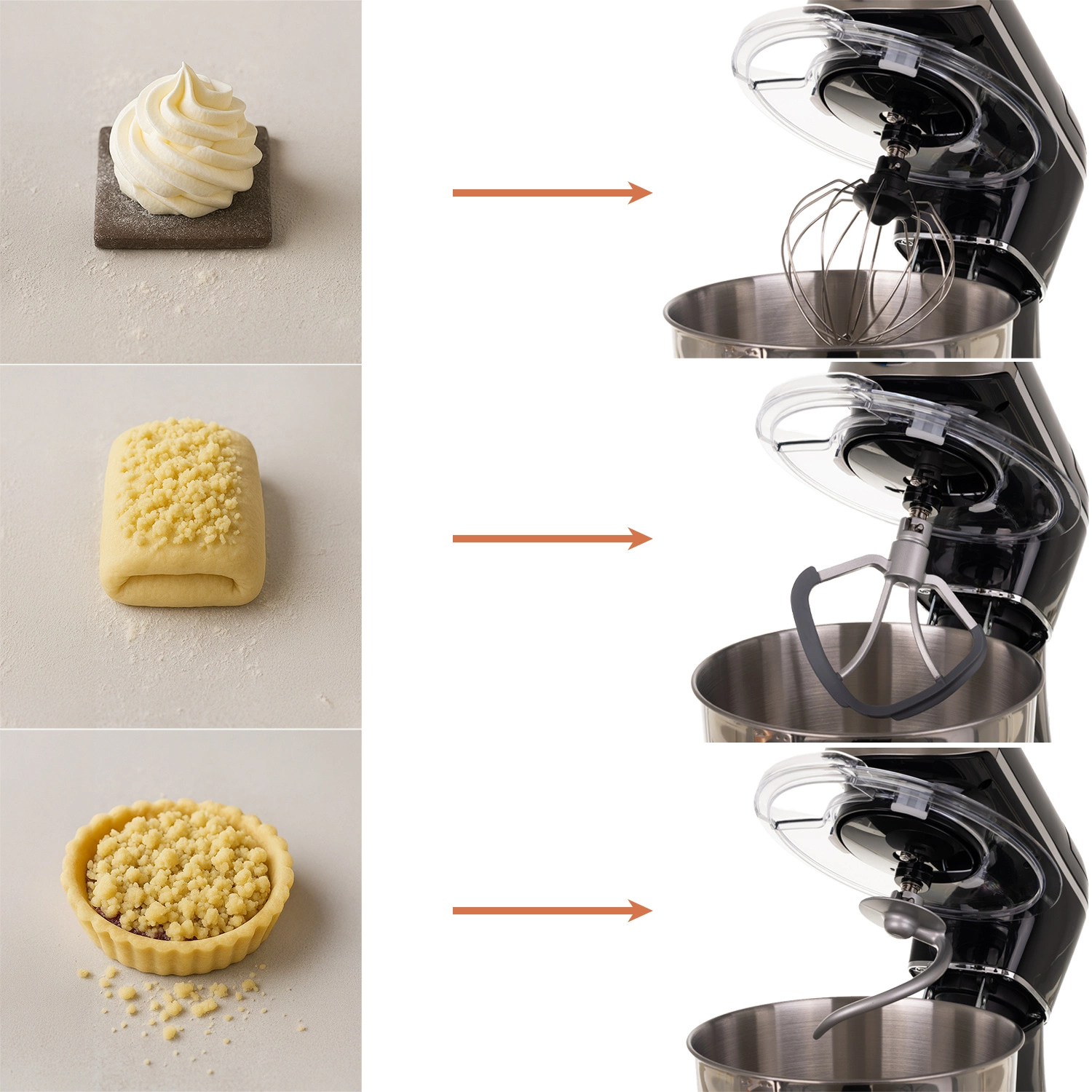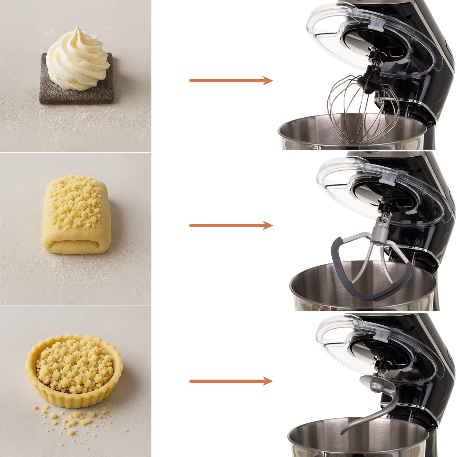 ✴️ 3 profesjonalne końcówki – hak, mikser i trzepaczka do każdej konsystencji – od ciężkich ciast po lekkie kremy