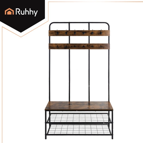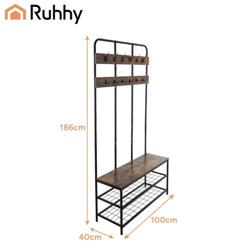 Regał stojący z wieszakiem Ruhhy - 182x100x35,5 cm - ławka siedzisko i 2 półki na buty - 12 haczyków na odzież - metalowa rama loft - stabilny organizer do przedpokoju