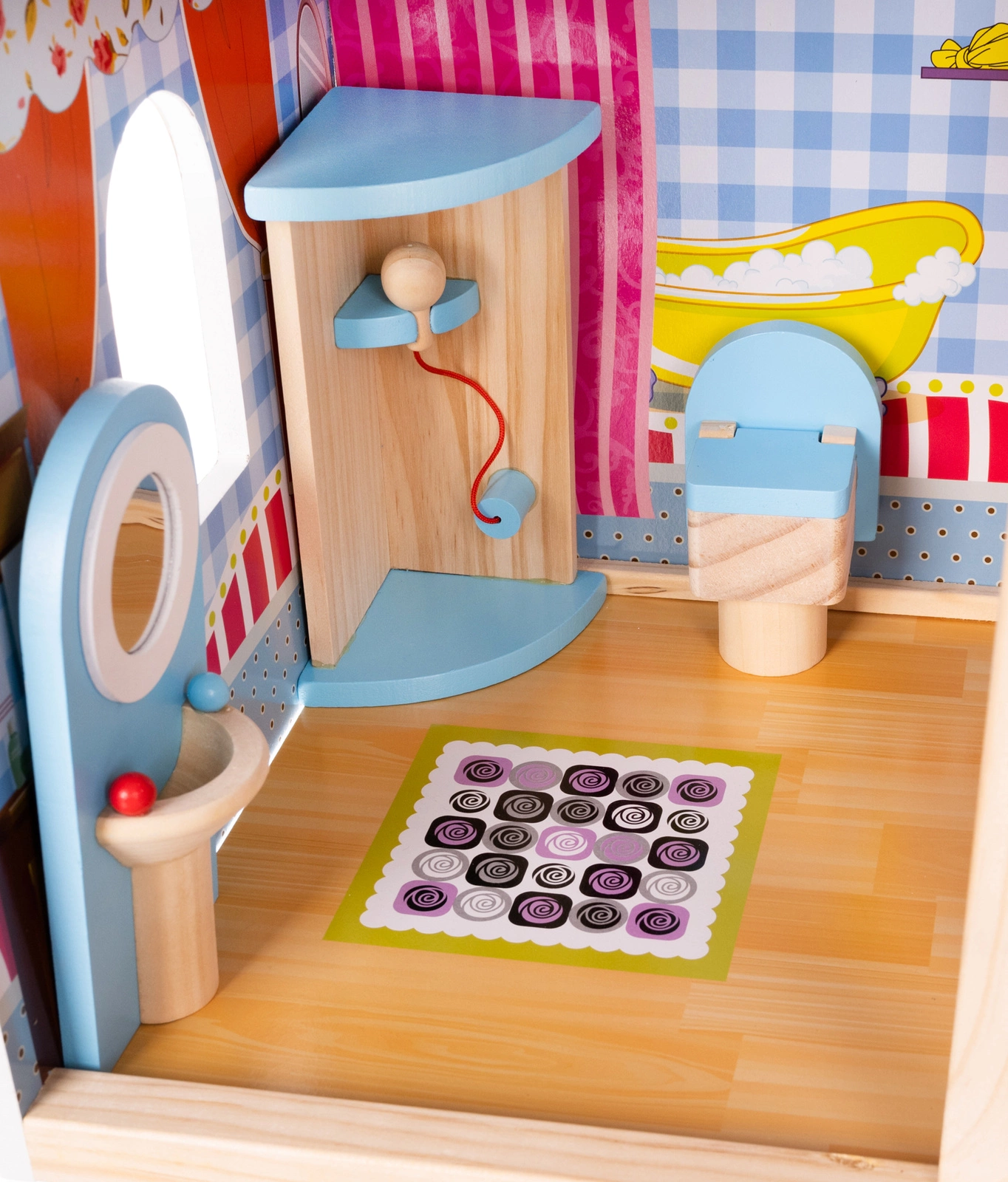 - SPECYFIKACJA – kolor: wielokolorowy; materiał: drewno; ilość elementów w zestawie: 18 + domek; ilość poziomów: 3; ilość pokoi: 5 + balkon i ogród z basenem; wymiary: 29 x 59 x 90 cm; waga: 10,9 kg; waga w opakowaniu: 13,05 kg