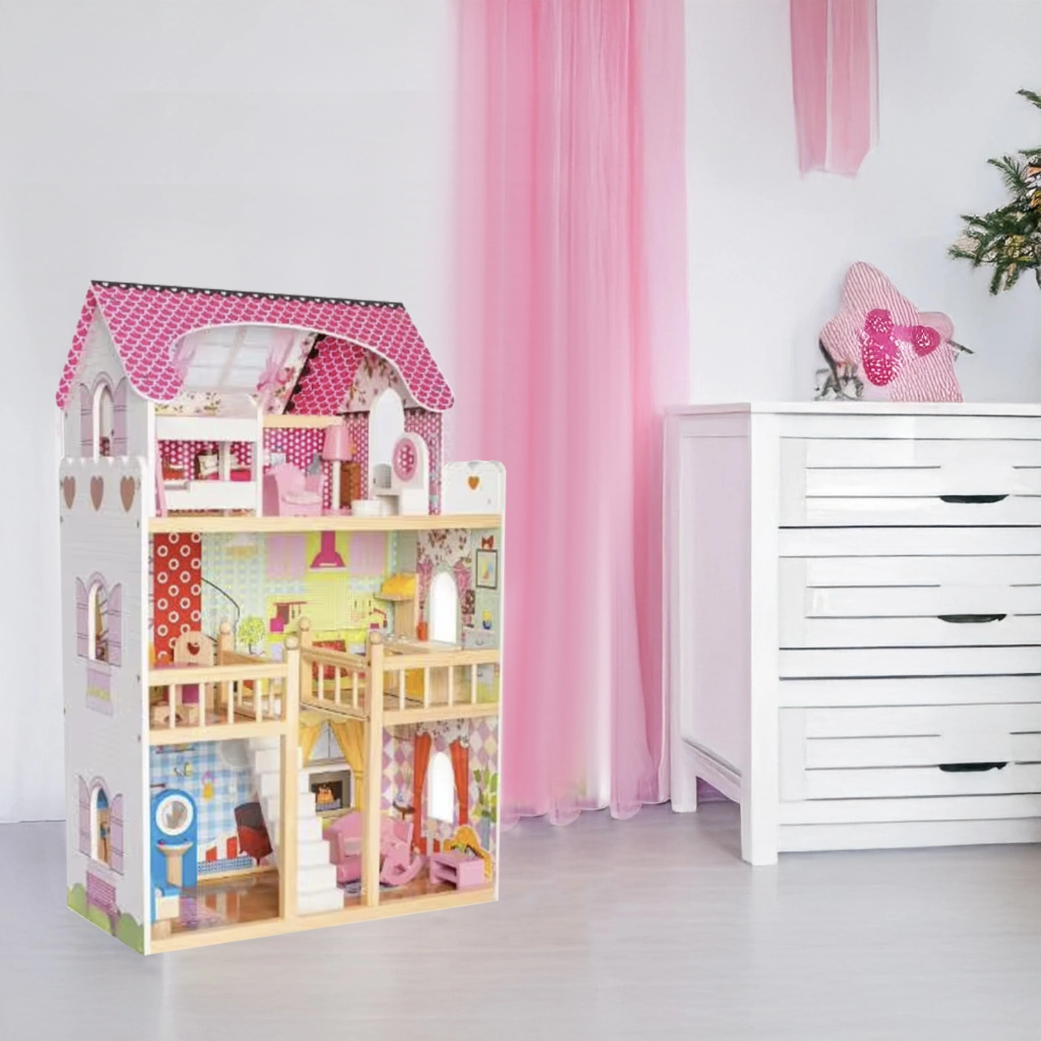 - PRZESTRONNY - drewniany domek dla lalek przeznaczony jest dla 4 osobowej rodziny lalek. Posiada 3 poziomy, które połączone są ze sobą pięknymi, białymi schodami, aż 5 pomieszczeń + balkon i ogród z basenem. Każda lala marzy o takim dużym domku!