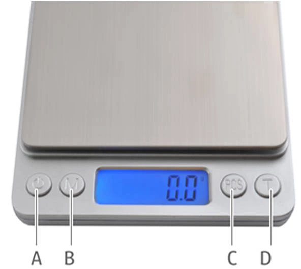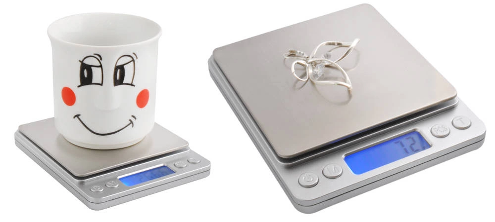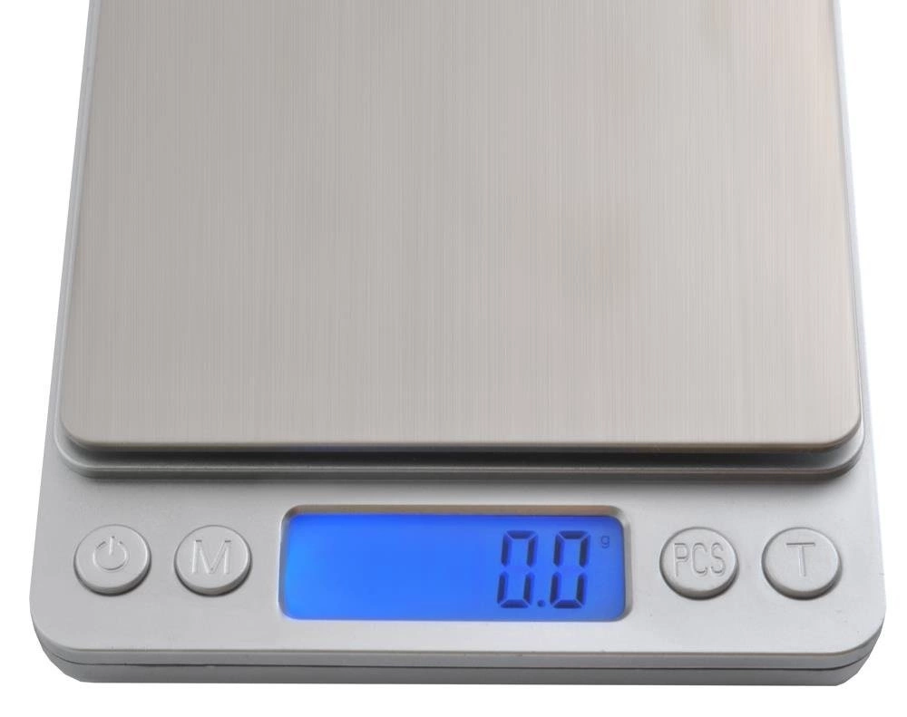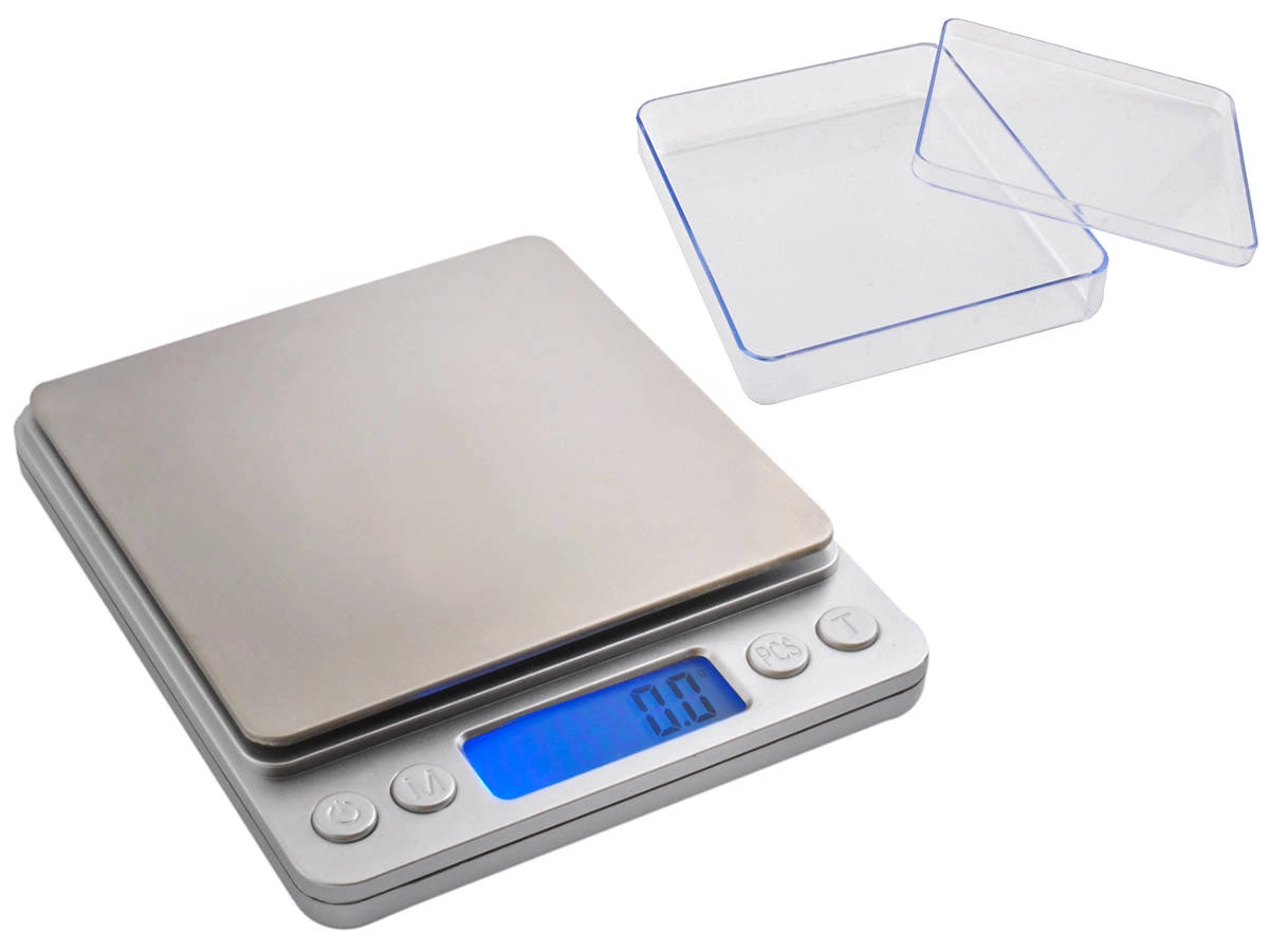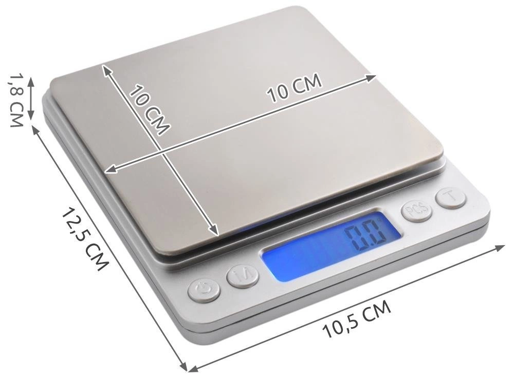 - SPECYFIKACJA - zakres pomiaru: 0-2kg; dokładność pomiaru: 0.1g; jednostki miary: g/oz/ozt/dwz/ct/gn/tl; materiał szali: stal; wyświetlacz: LCD podświetlany na niebiesko; zasilanie: 2 x bateria AAA (w zestawie); wymiary wagi (dł/szer/grub): 12,5x10,5x1,8cm; wymiary szalki: 10x10cm; waga własna produktu: 300g.